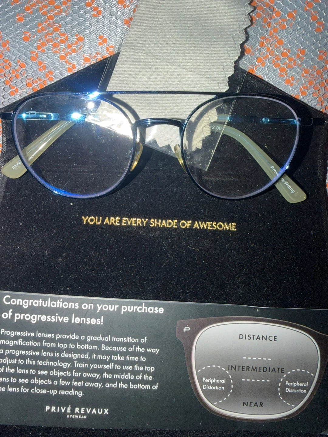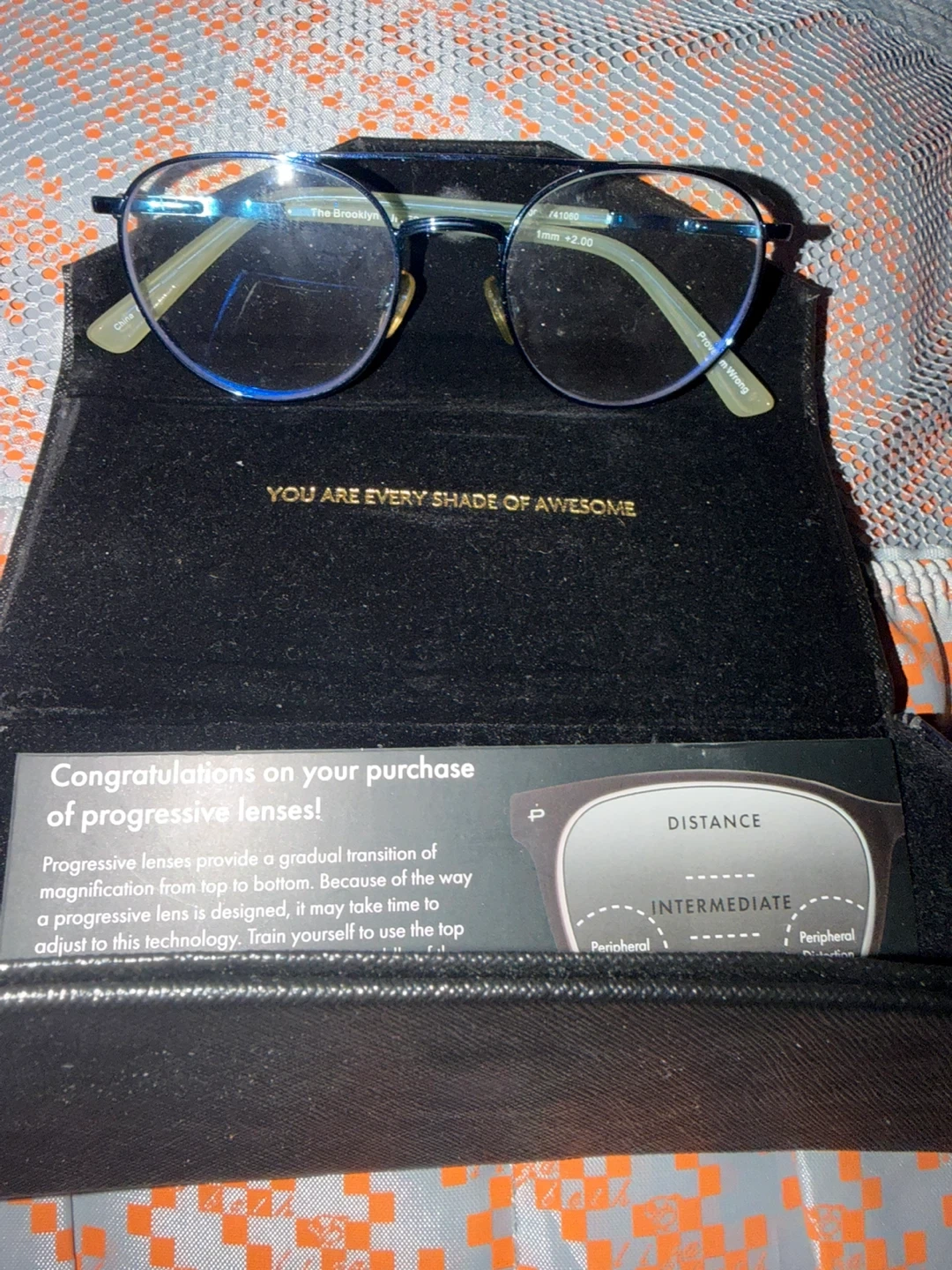 Privé Revaux progressive glasses with blue light blocking lenses. These glasses offer a gradual transition of magnification for distance, intermediate, and near vision. Designed with a stylish blue frame. Comes with a protective case.