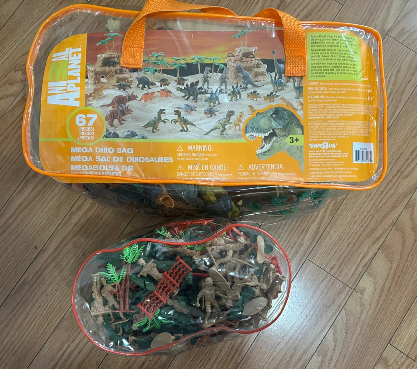 This toy set includes the Animal Planet Mega Dino Bag with 67 pieces of dinosaurs and accessories. Also included is a separate bag filled with plastic soldiers and foliage. It's suitable for ages 3 and up. Hours of imaginative play await!