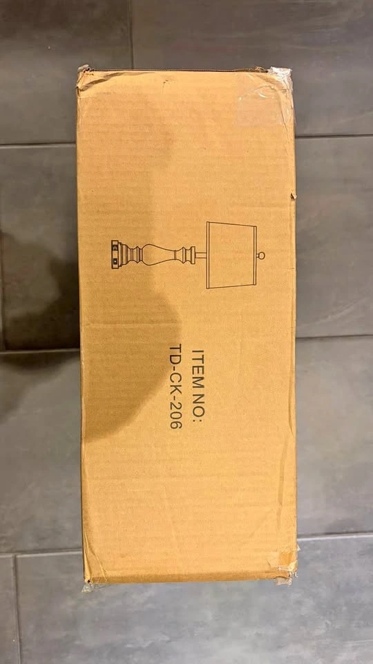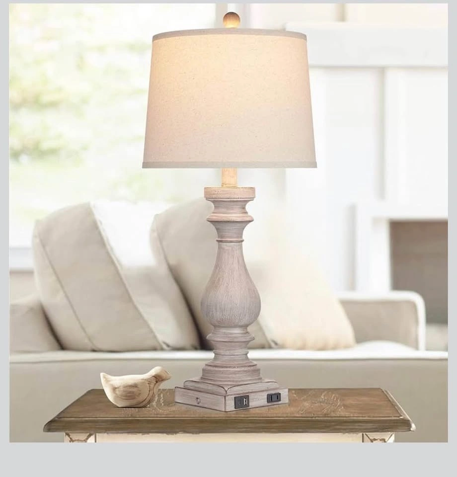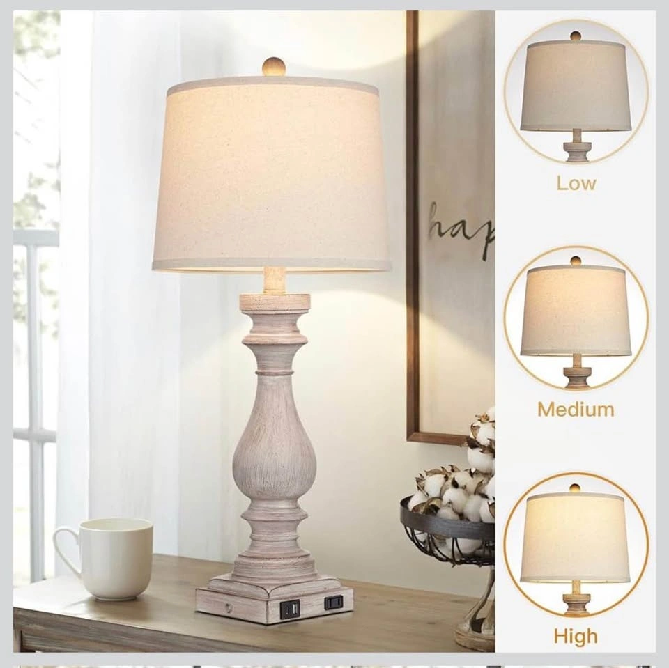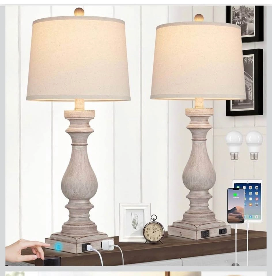 Brand new table lamps in box. Each lamp has a beige fabric shade, lamp body, socket assembly, harp, and finial. Instructions are included for easy setup. All parts are still wrapped in original packaging.
