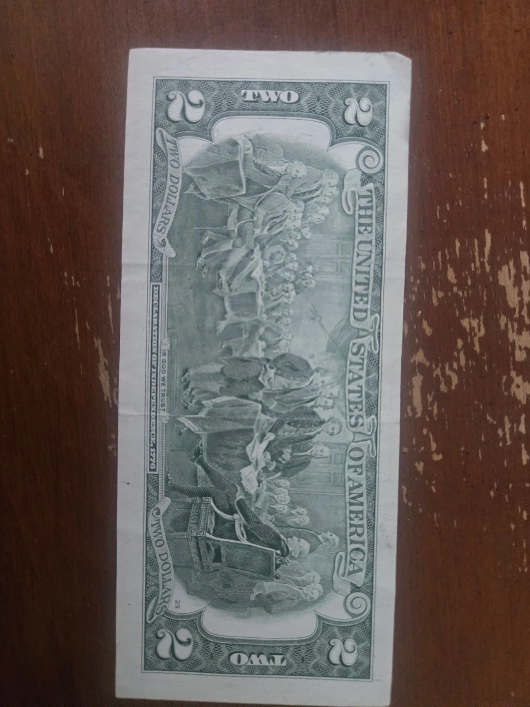 This is a genuine United States two-dollar bill. It features Thomas Jefferson on the obverse. The reverse depicts the painting "The Declaration of Independence". Rare imprint line in the picture. Also 2003 series.