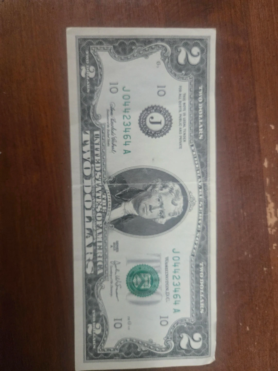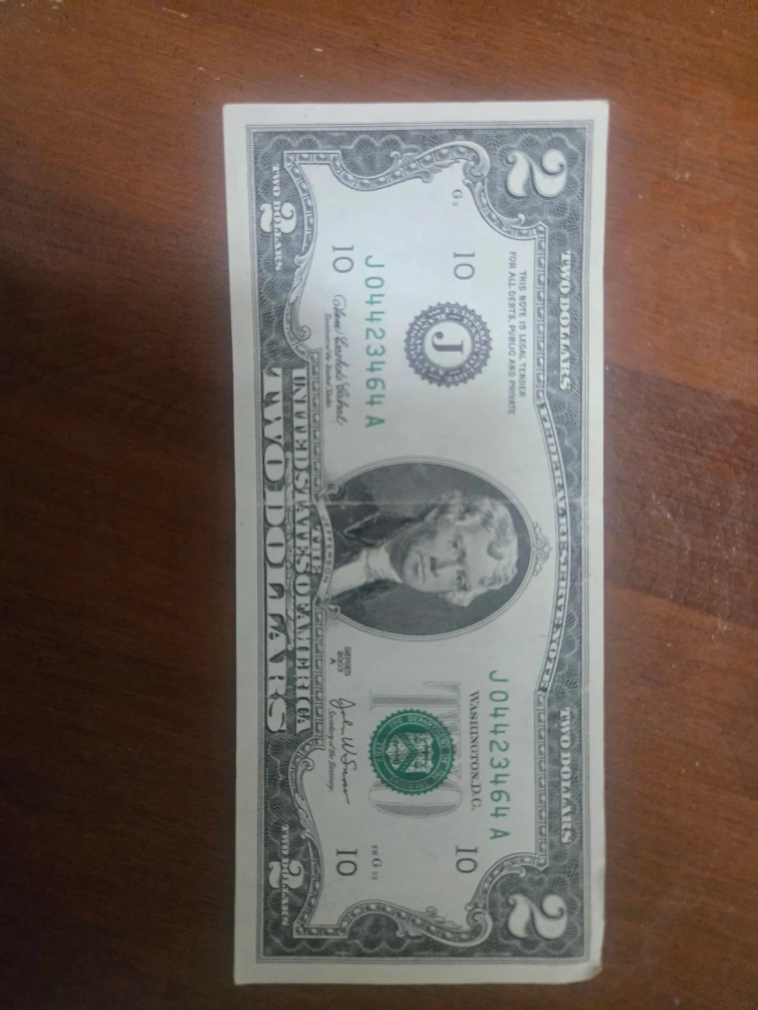 This is a genuine United States two-dollar bill. It features Thomas Jefferson on the obverse. The reverse depicts the painting "The Declaration of Independence". Rare imprint line in the picture. Also 2003 series.