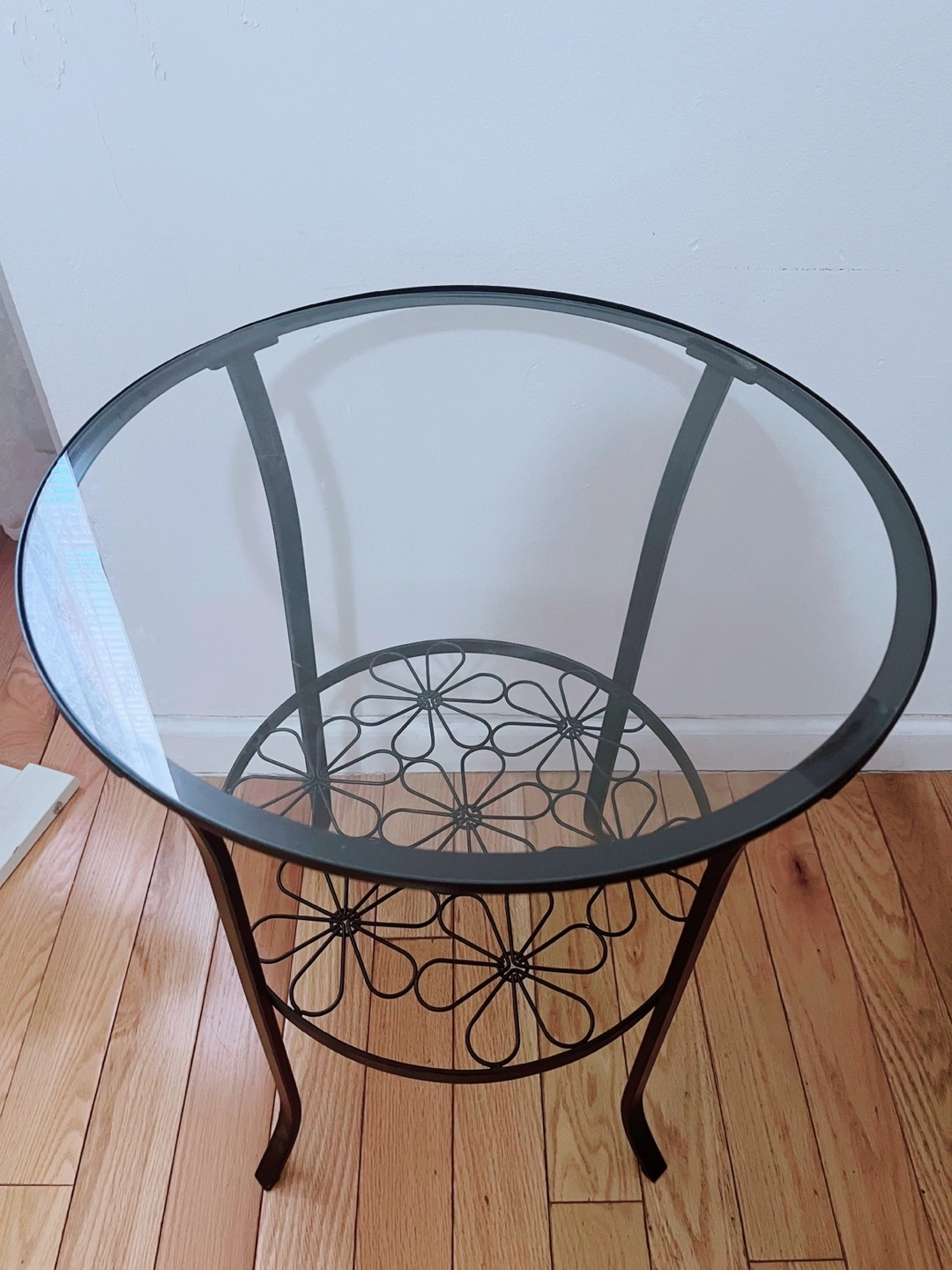 Round glass top. Black metal frame. Lower shelf with decorative metal floral accents. Small side table, perfect for apartment.