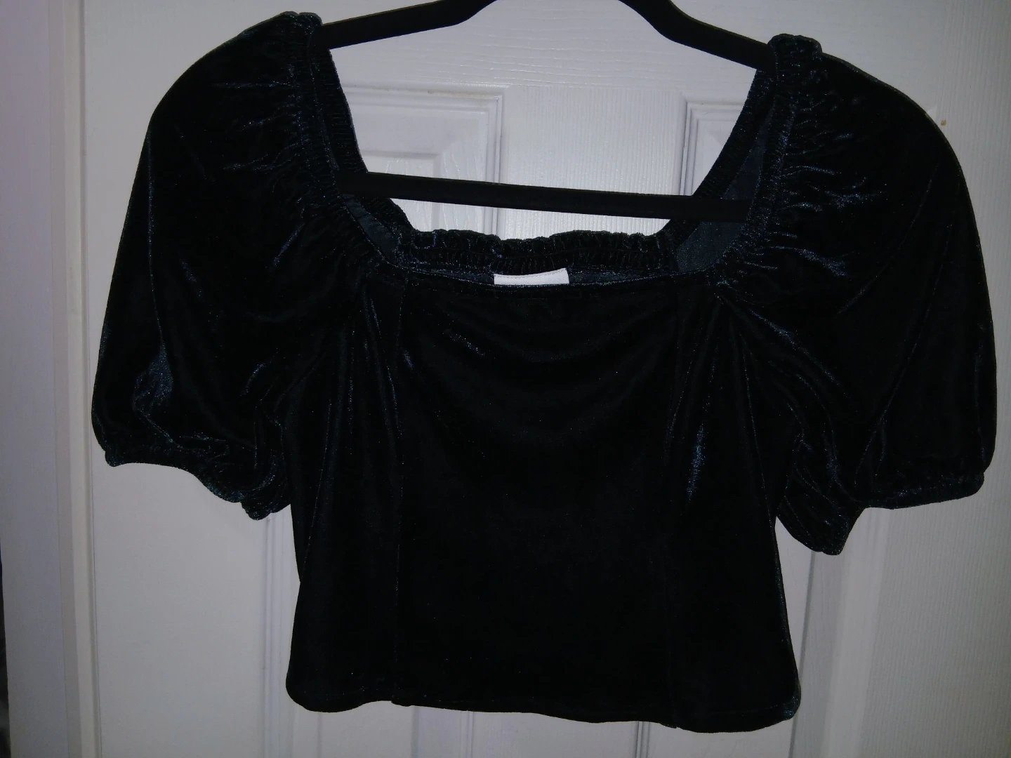 This dark green velvet crop top from GAP Teen. It has puff sleeves and a square neckline & can also be worn off shoulder. It's a size 12, NWT.
