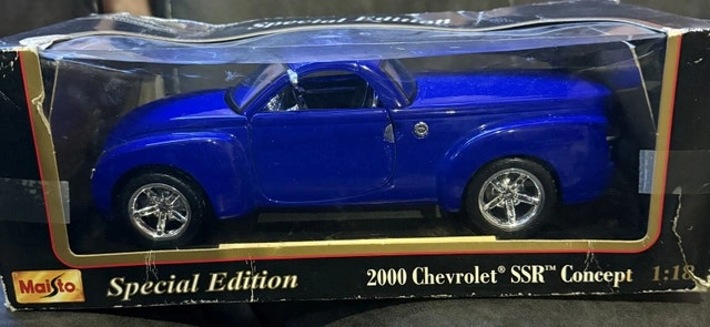 I'm offering a Maisto Special Edition 2000 Chevrolet SSR Concept, a detailed 1:18 scale die-cast model. The car is pristine, but the box shows some wear and tear from storage. This is reflected in the price. Let me know if you're interested!