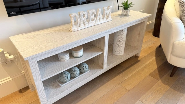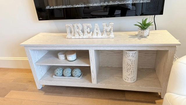 Moving Sale! This is a beautiful, used white wash entertainment center that offers both style and functionality for your living space. The unit features open shelving and a sturdy top, perfect for displaying your TV and storing media devices. Colour: White Wash, Style: Modern, Shelving: Open shelving, Condition: excellent, Dimensions: 58”L x 15 3/4”D x231/2”H. Original price $293. Pick up in Quarry Park SE. Cash only.