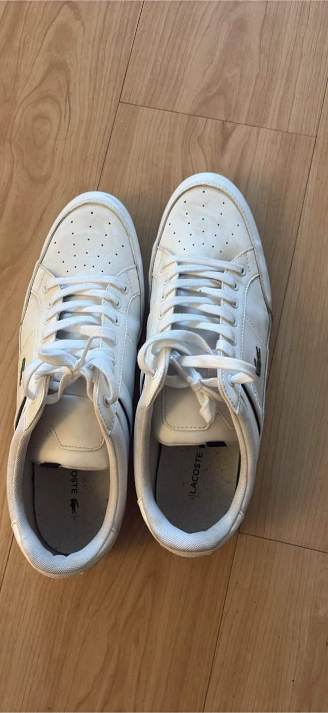 White leather sneakers from Lacoste. Features a classic design with side logo detailing and lace-up closure. These are stylish and comfortable for everyday wear.