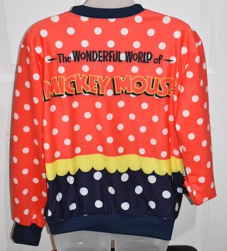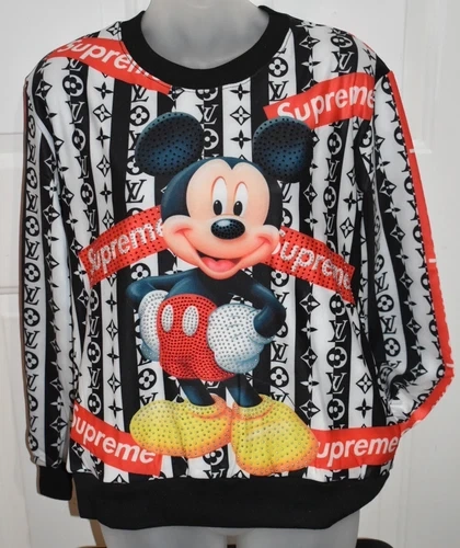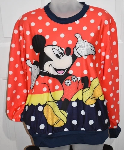 This sports sweatshirt features a colorful Disney theme with Mickey Mouse and other cartoon characters. The pullover style is perfect for activewear, and the rhinestone accents add a touch of sparkle to the design. It is available in women's size M/L and is made of regular size type. The hoodie is perfect for Disney fans and those who love to add a touch of glamour to their activewear.