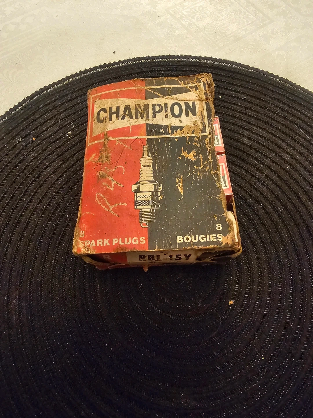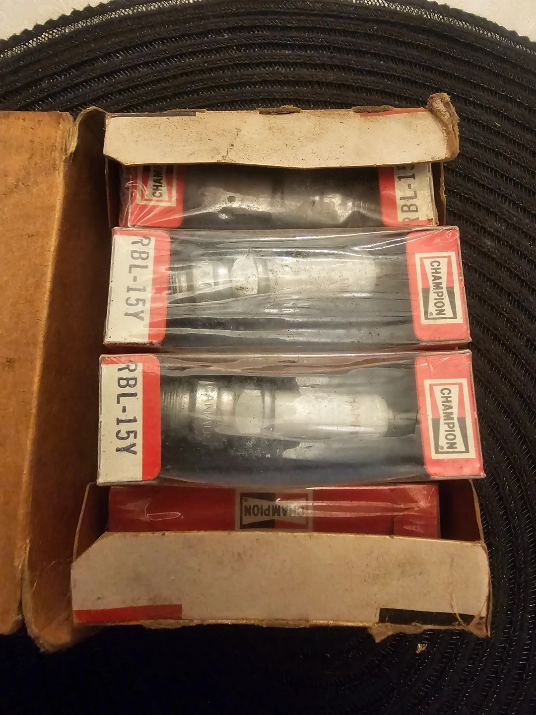 This is a vintage 7-pack of Champion RBL-15Y spark plugs. They are individually wrapped. The box shows wear but the plugs appear to be in good condition. (New)