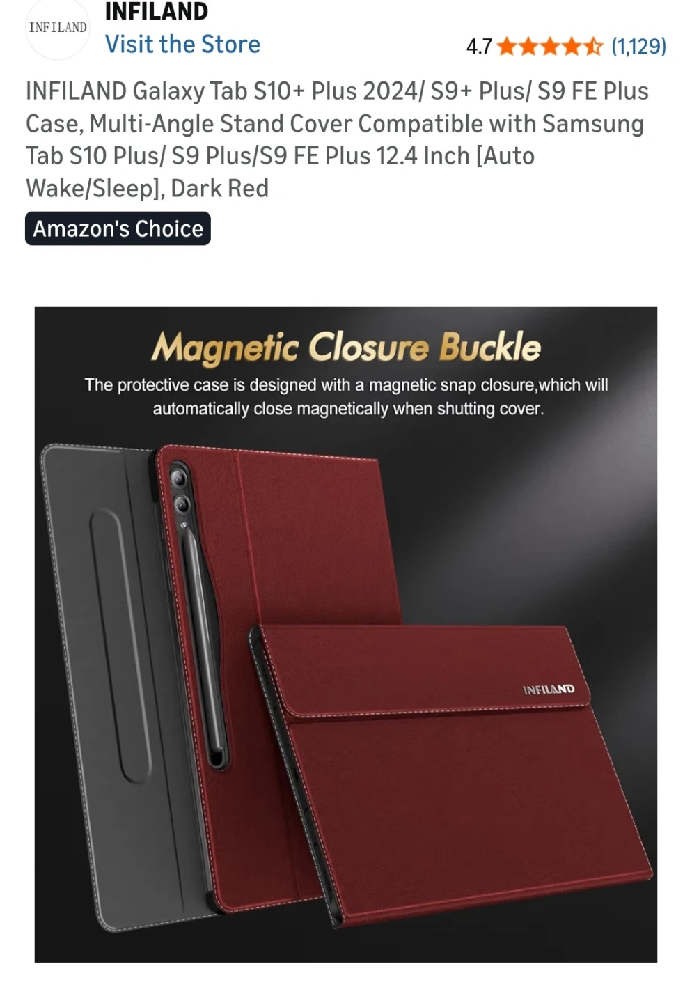 This is an INFILAND tablet PC case in dark red. It's designed for Samsung Galaxy Tab S10 Plus, S9 Plus, and S9 FE Plus models. The case features a multi-angle stand and a magnetic closure buckle for auto wake/sleep functionality.