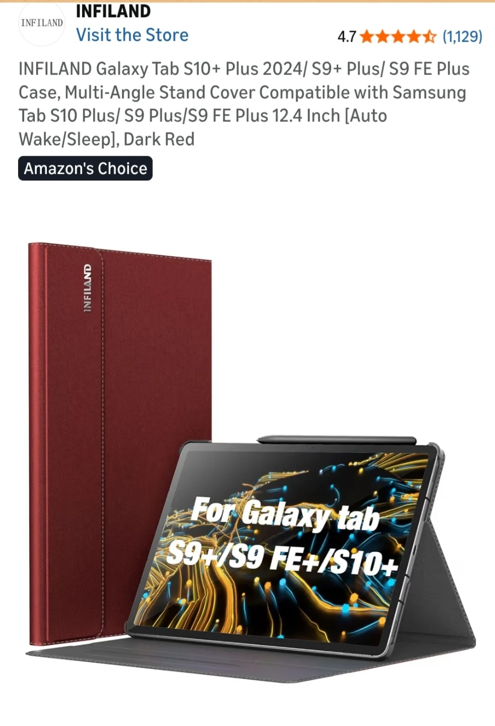 This is an INFILAND tablet PC case in dark red. It's designed for Samsung Galaxy Tab S10 Plus, S9 Plus, and S9 FE Plus models. The case features a multi-angle stand and a magnetic closure buckle for auto wake/sleep functionality.