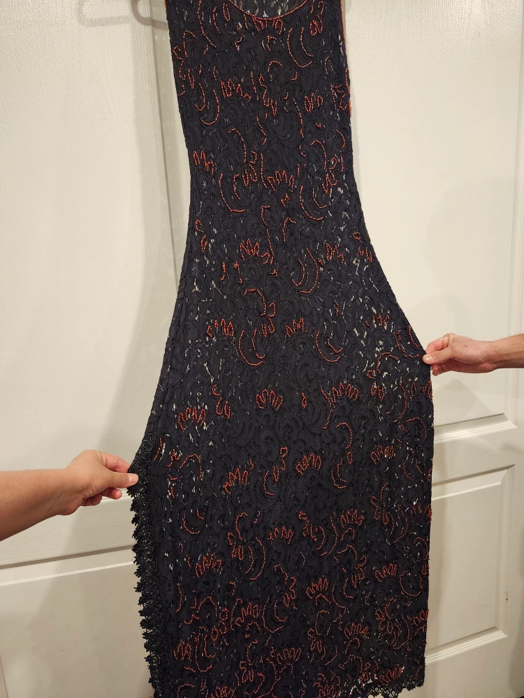 Black lace dress with red bead embellishments. Sleeveless, side cut , handmade and hand embroidered, once wore for fashion week walk.