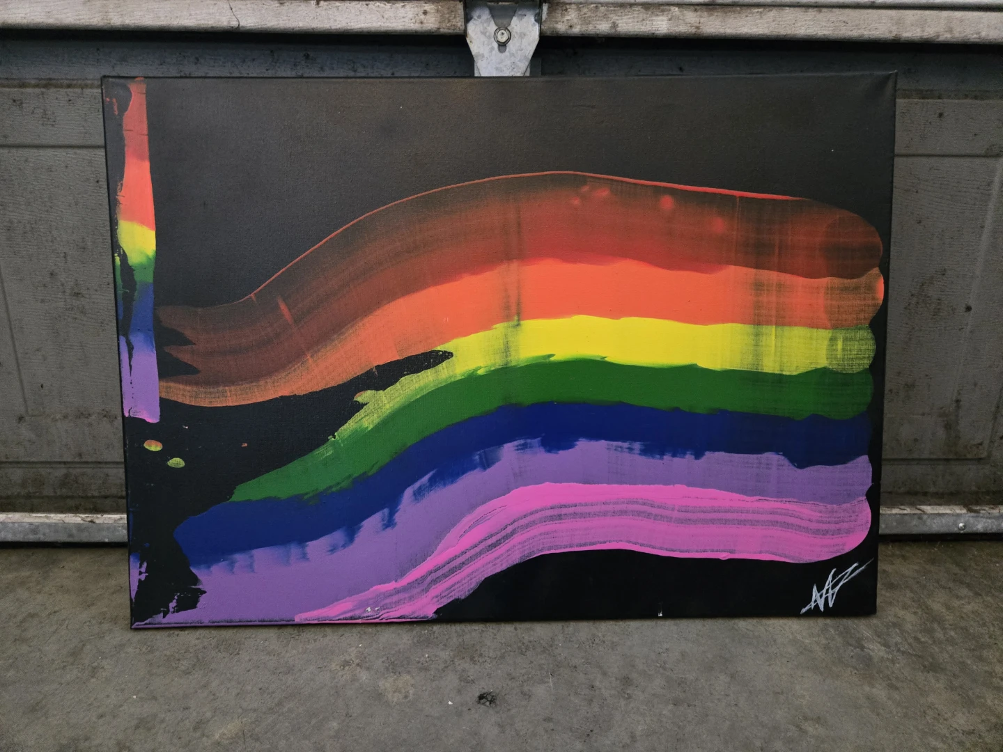 Handpainted abstract rainbow art on a large canvas. Features bold brush strokes in a spectrum of colours against a black background. Signed by me on the bottom right.