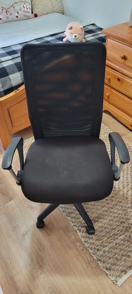 Black mesh office chair with arms. Has wheels and a swivel base. Working and good conditions.