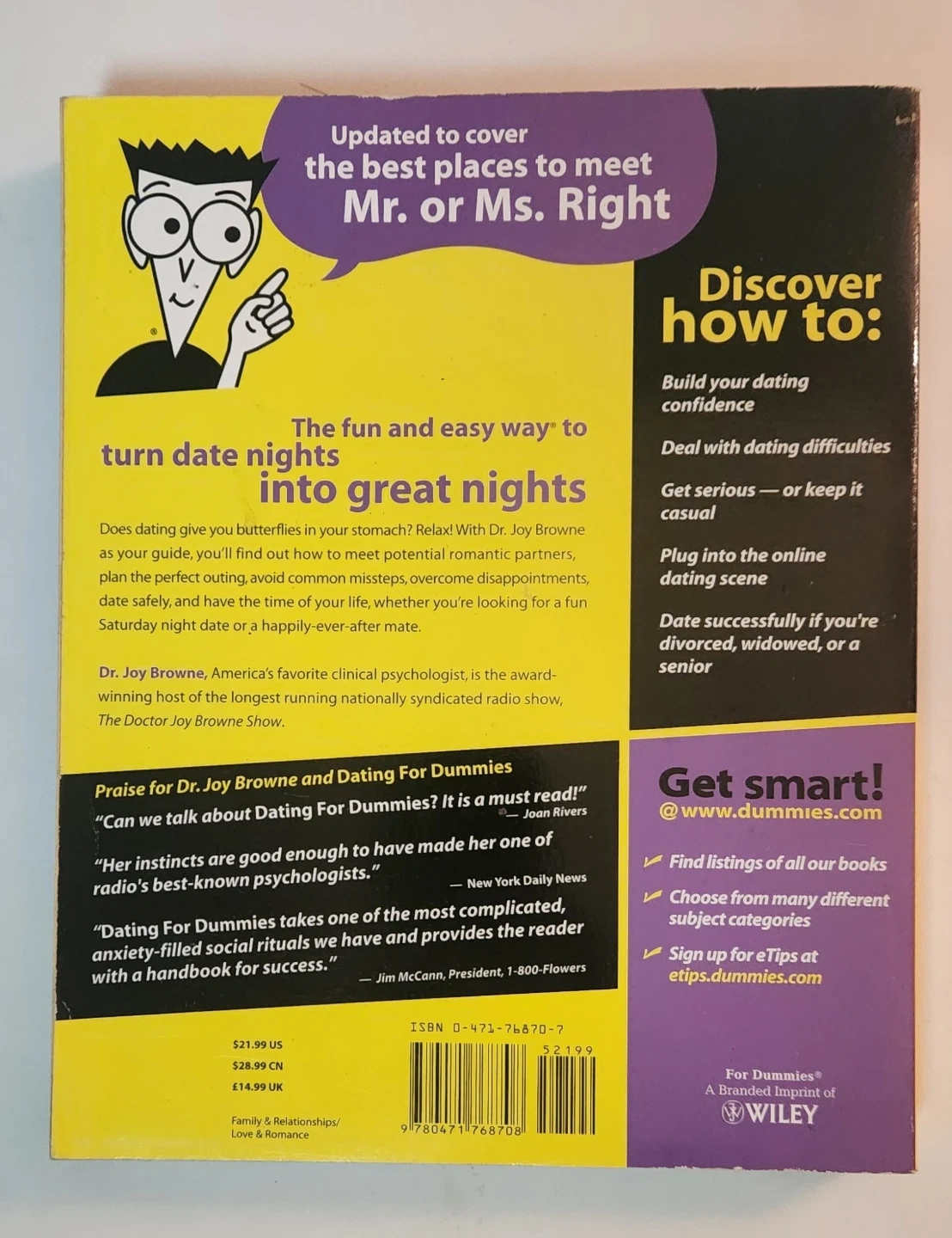 Dating For Dummies, 2nd Edition includes advice for special dating situations such as long-distance relationships, office romances, single parents, senior citizens, and more. It gives you worksheets to help you objectively analyze your date expectations and evaluate a relationship. Packed with real-world wisdom, confidence boosters, and a dash of humor, this is the guide to help you get out of exile, get into dating, and perhaps even get into a meaningful relationship.