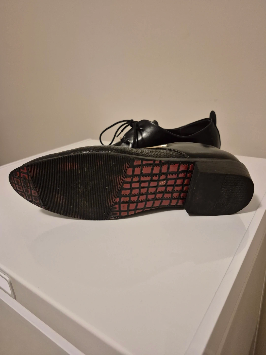 Classic black leather dress shoes with a polished finish. Features a textured detail on the toe box and gold-tone accents. Lace-up closure for a secure fit. Great for any formal events or work!