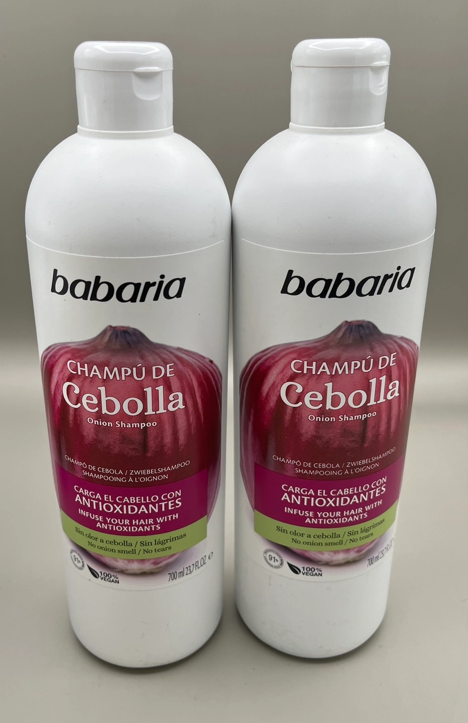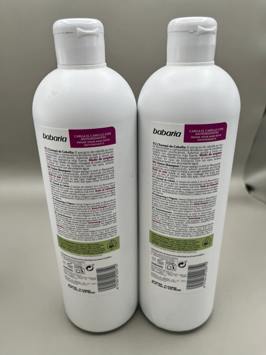 Two bottles of Babaria Champú de Cebolla Onion Shampoo. 700ml each. Infused with antioxidants. No onion smell, no tears. Vegan.