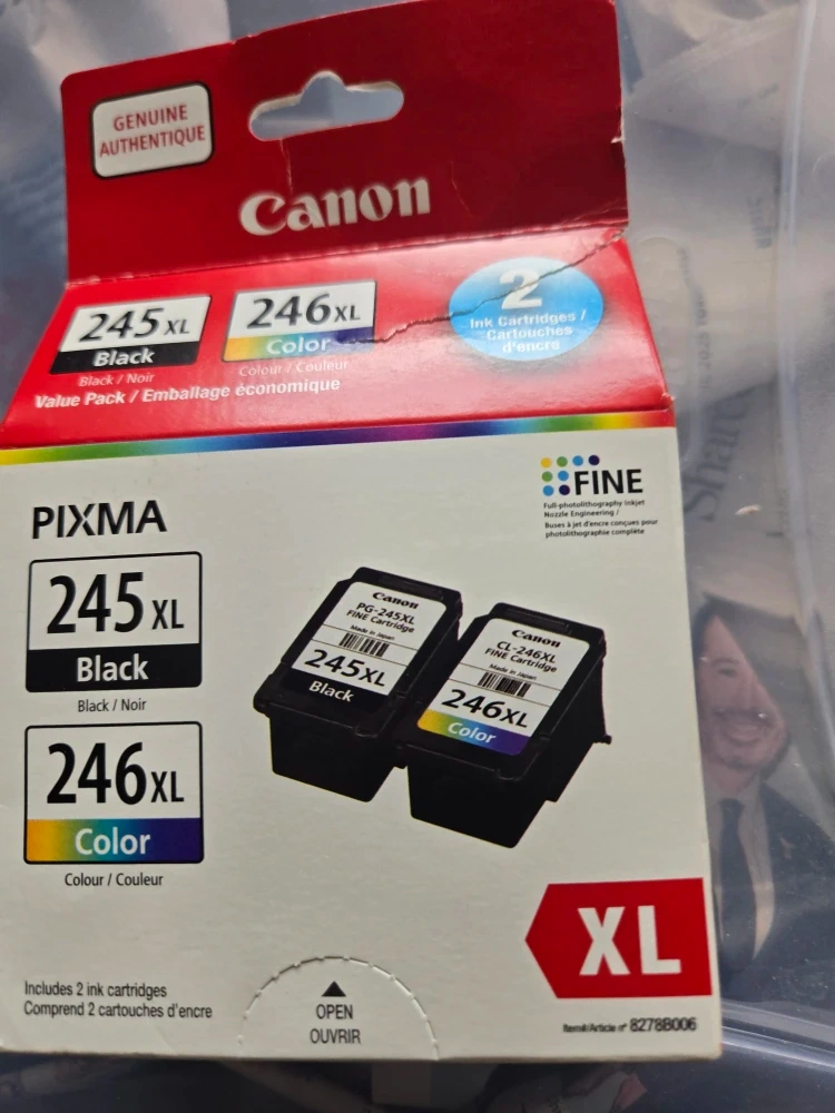 This is a value pack of two Canon XL ink cartridges, one black (245XL) and one colour (246XL). They're designed for Canon PIXMA printers. Made in Japan.