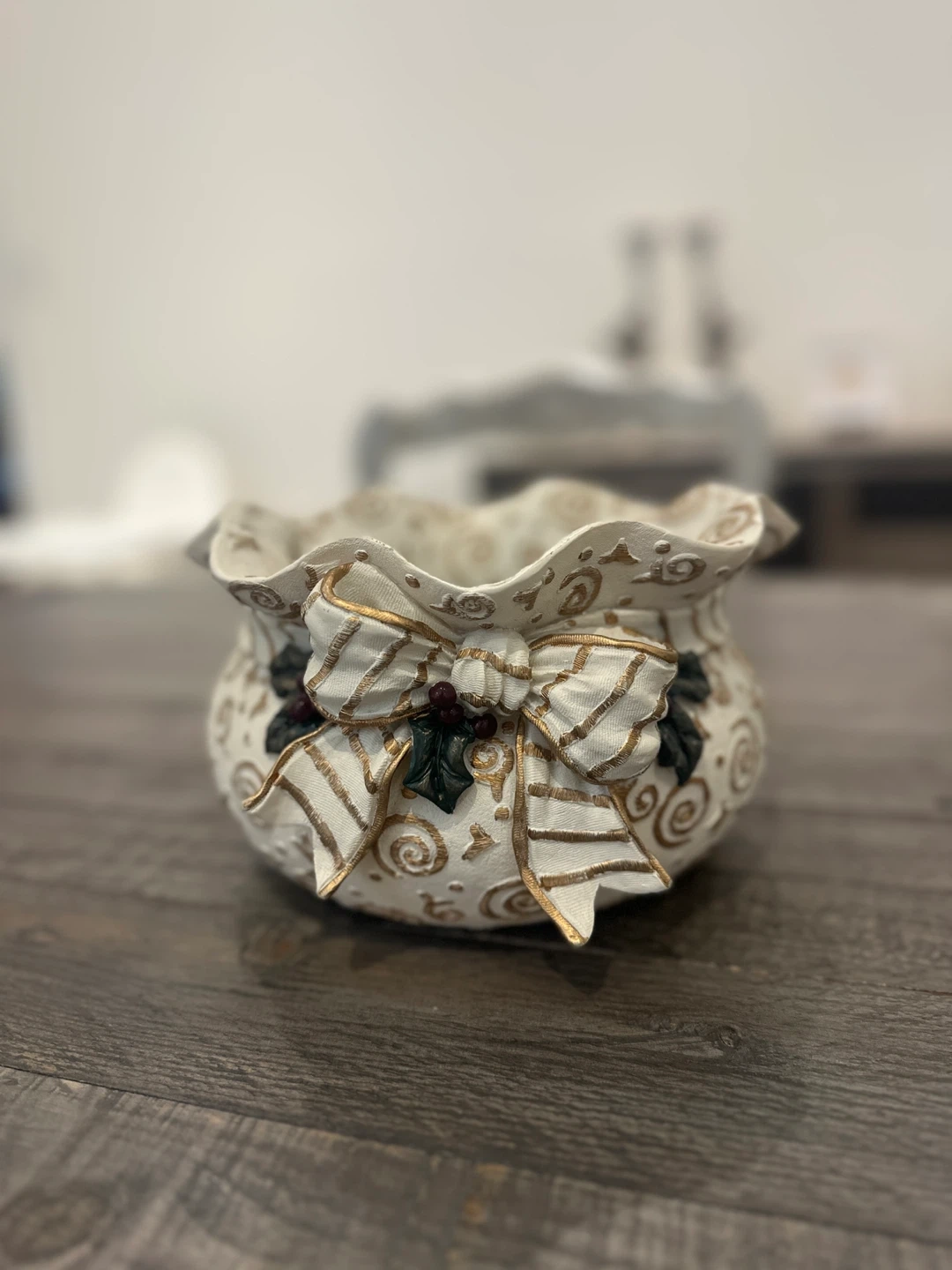 Selling a decorative pot with a holiday theme. It features a white and gold design with a bow, perfect for adding a festive touch to your home decor.