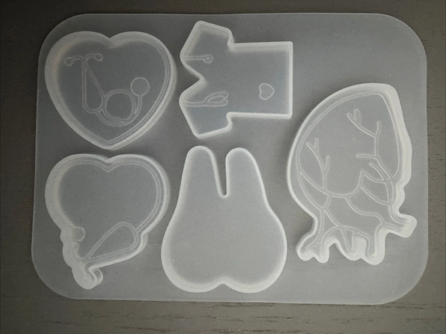 Silicone mold with various medical and dental themed shapes. Includes heart with stethoscope, nurse scrub top, tooth, and anatomical heart molds. Great for resin crafts or DIY projects! Never used