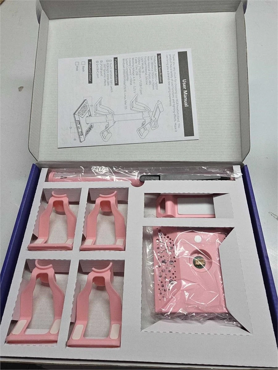 This pink charging stand accommodates two controllers and a headset, featuring RGB lighting for ambiance. It also includes charging ports for up to three phones. The stand is made of plastic and comes with all necessary components for setup.