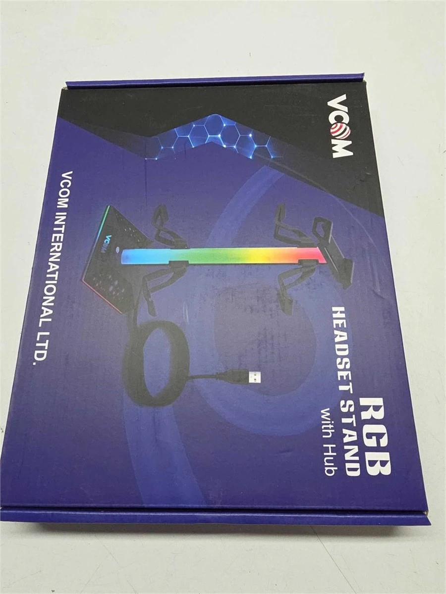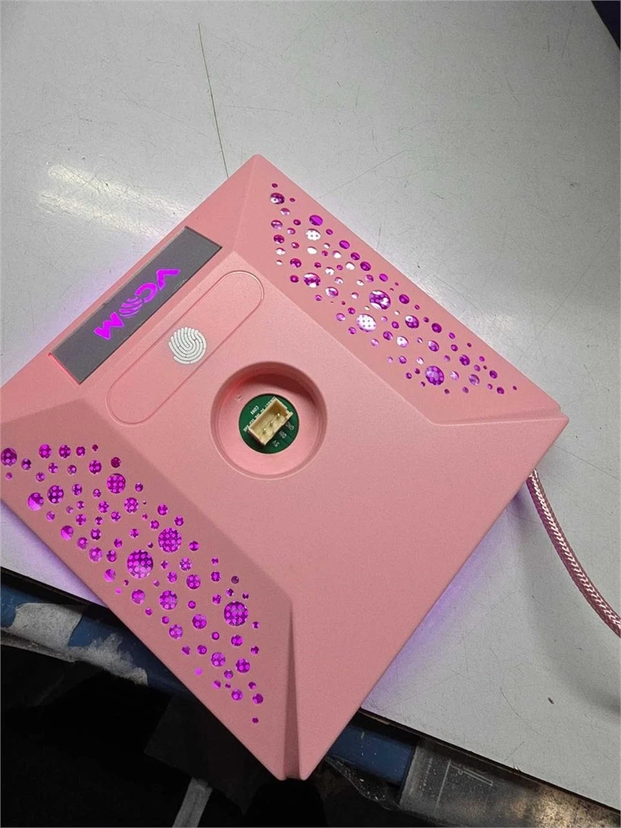This pink charging stand accommodates two controllers and a headset, featuring RGB lighting for ambiance. It also includes charging ports for up to three phones. The stand is made of plastic and comes with all necessary components for setup.