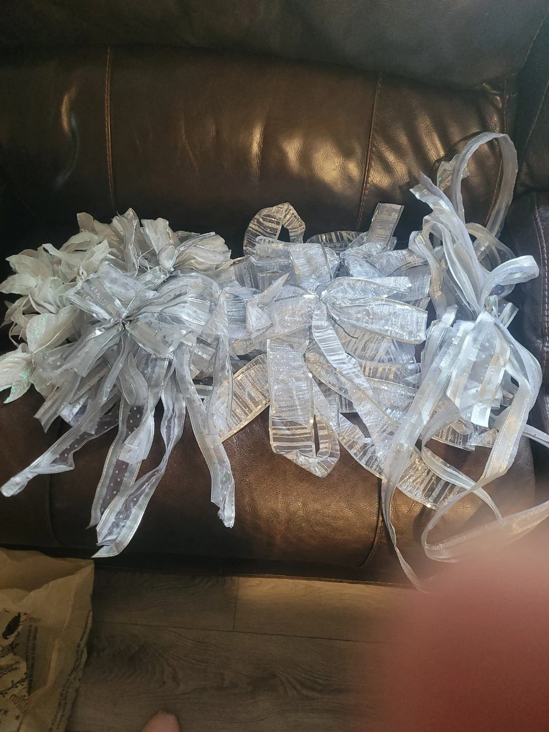 A collection of silver ribbons, some already tied into bows. These decorative ribbons are ideal for gift wrapping or holiday decorations. They're made of a sheer material with a subtle sparkle.