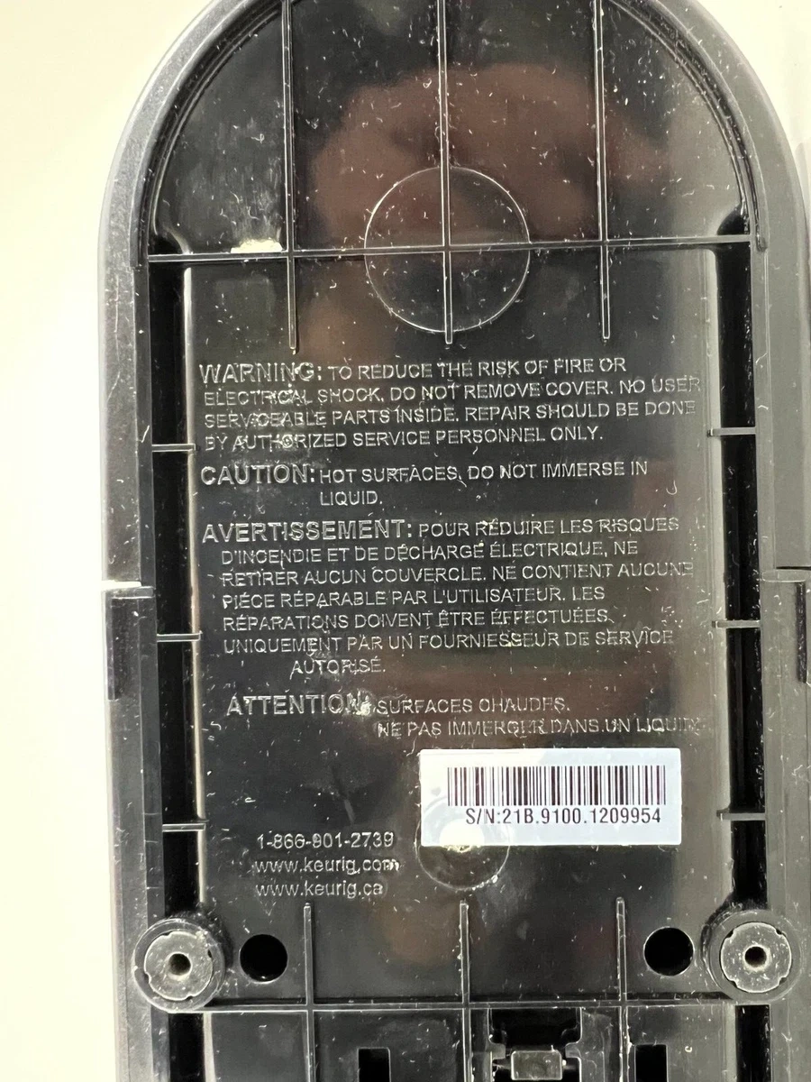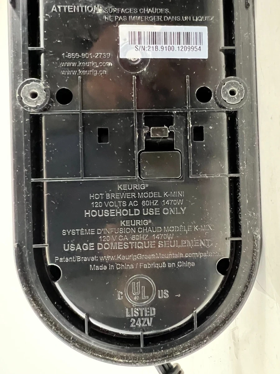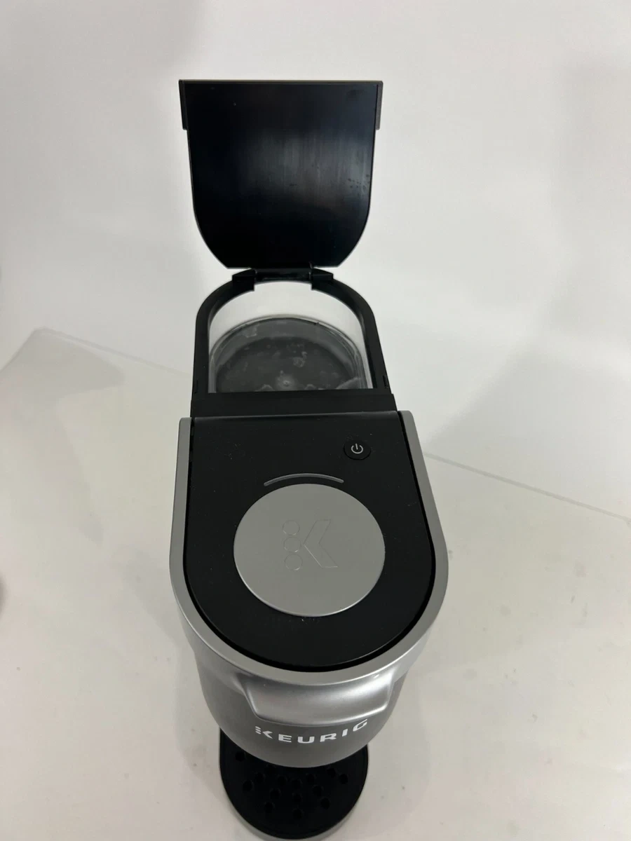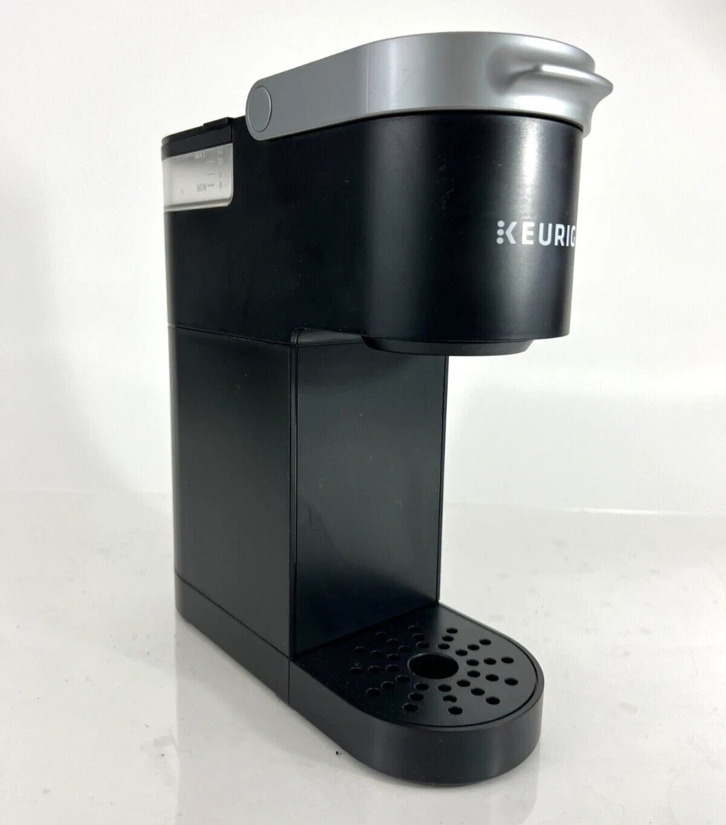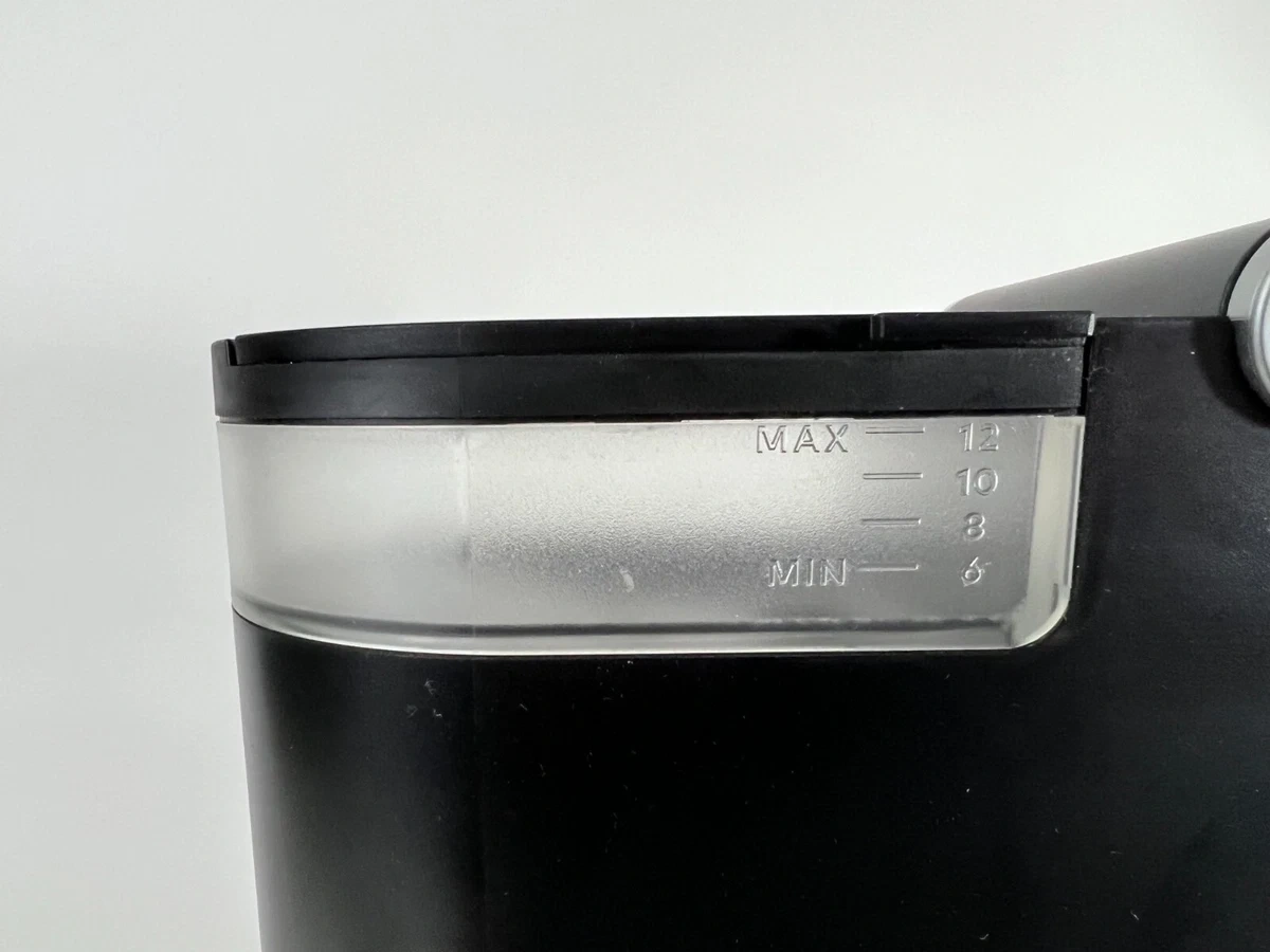This black Keurig K-Mini coffee maker brews single cups of coffee. It has a water reservoir with markings for minimum and maximum fill levels. The K-Mini is designed for countertop use.