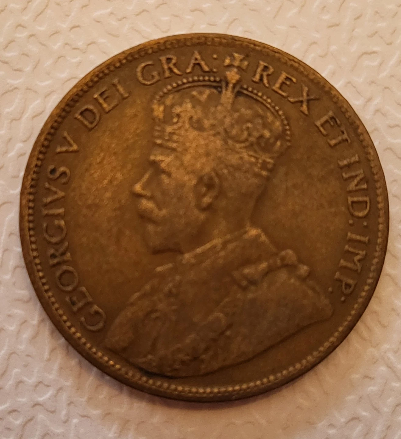 This is an antique 1916 Canadian one-cent coin. It features King George V on the obverse. It's a copper-nickel alloy.
