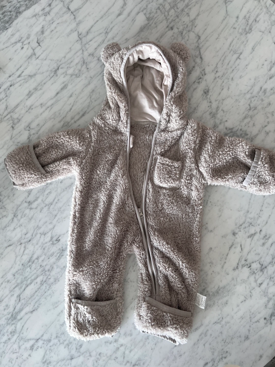 Cozy fuzzy fleece snowsuit with bear hood. 100% Polyester. Perfect for keeping your little one warm on chilly days! only wore once. like new.