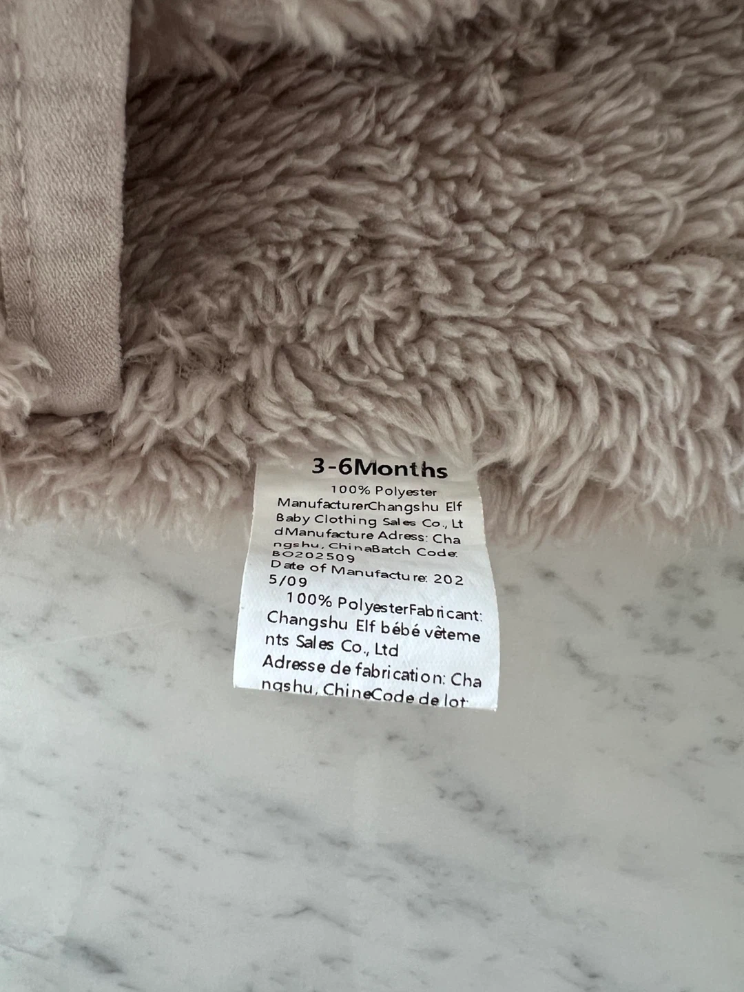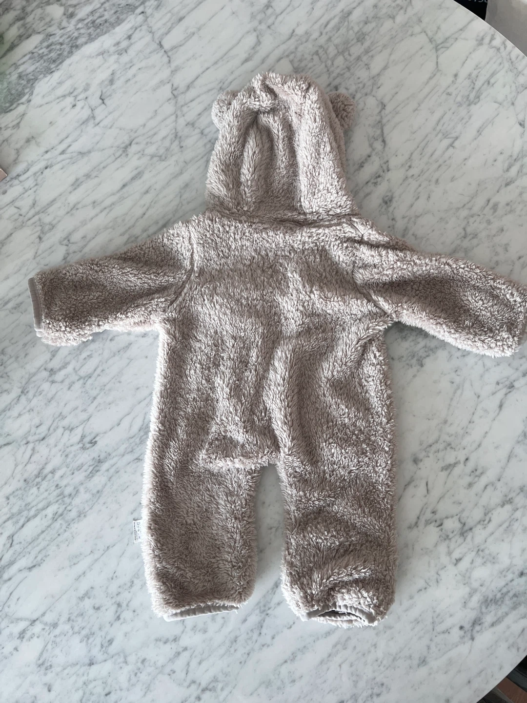 Cozy fuzzy fleece snowsuit with bear hood. 100% Polyester. Perfect for keeping your little one warm on chilly days! only wore once. like new.
