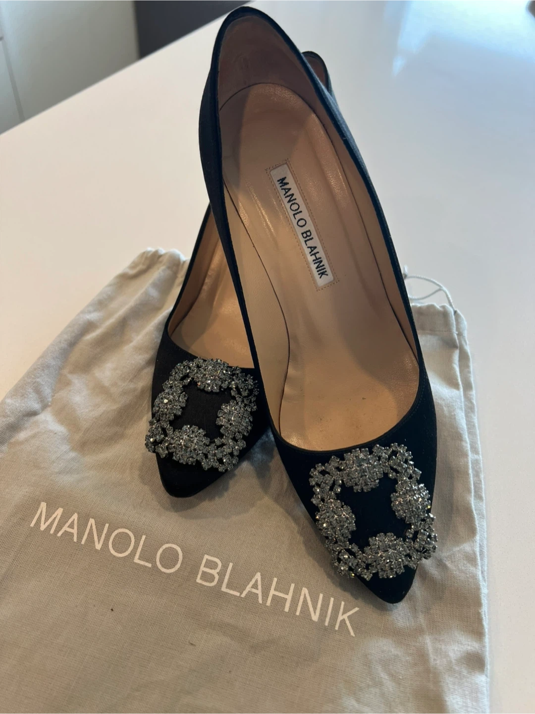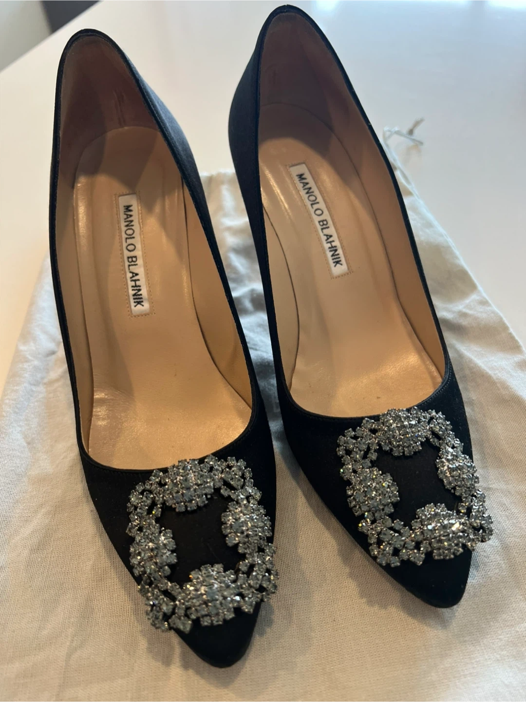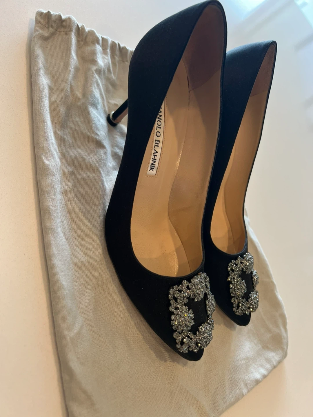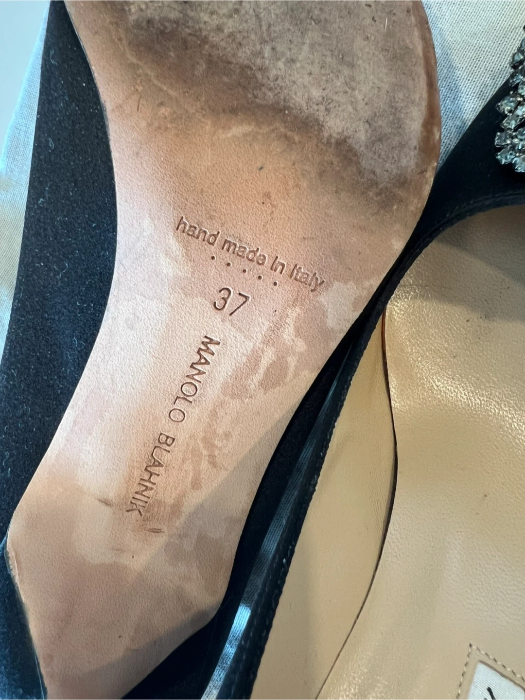 Manolo Blahnik Hangisi 70 black satin jewel buckle pumps. Hand made in Italy. Includes dust bag. Size 37.