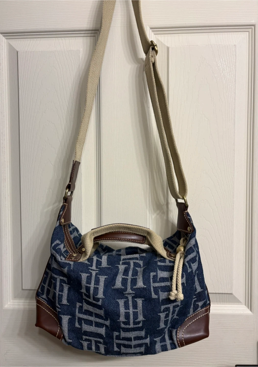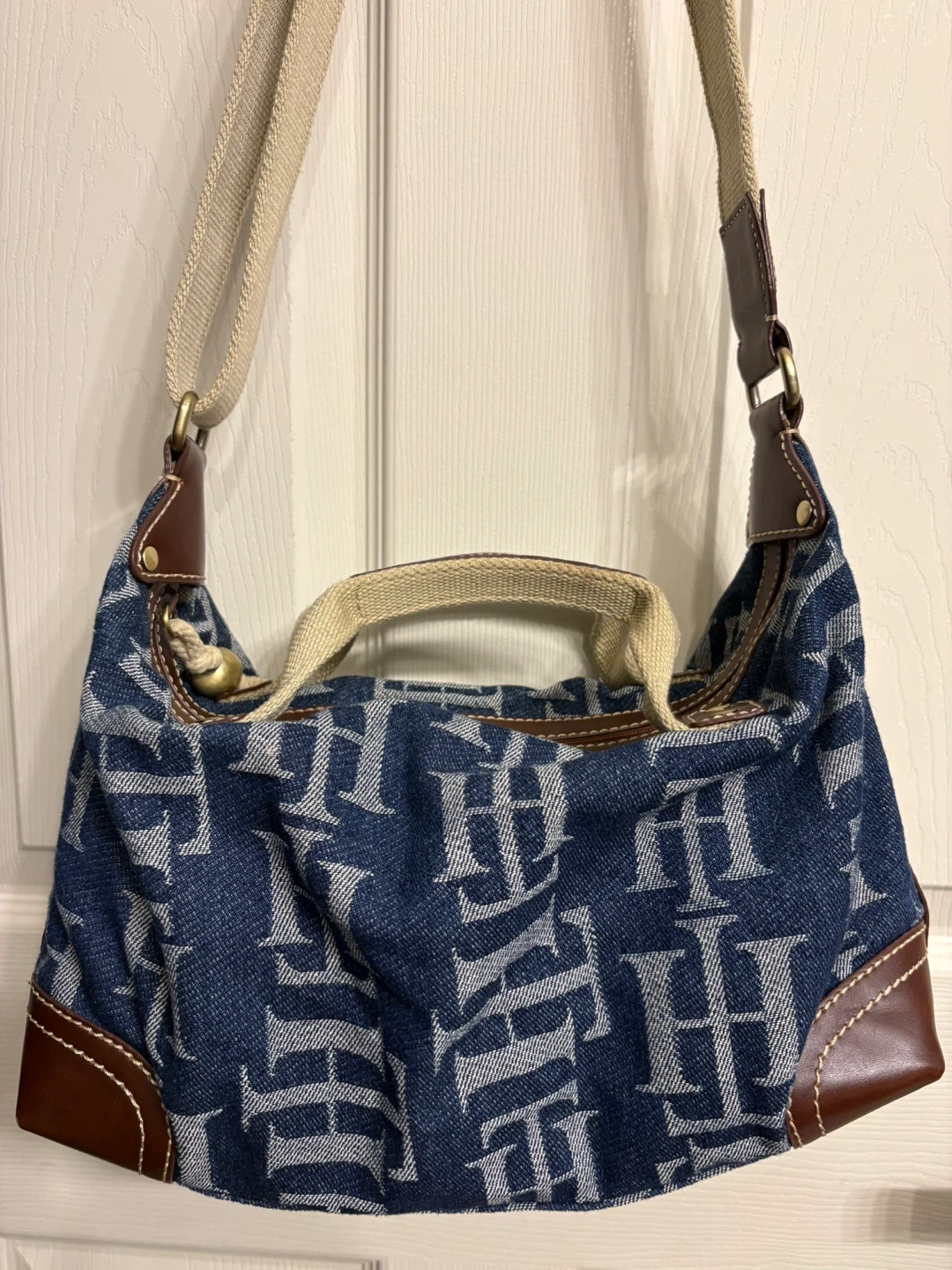 This Tommy Hilfiger shoulder bag features a denim exterior with the TH monogram print. It has brown faux leather trim and strap details. It's a stylish everyday bag. This beautiful bag is in perfect condition! Pick up in Chestermere.