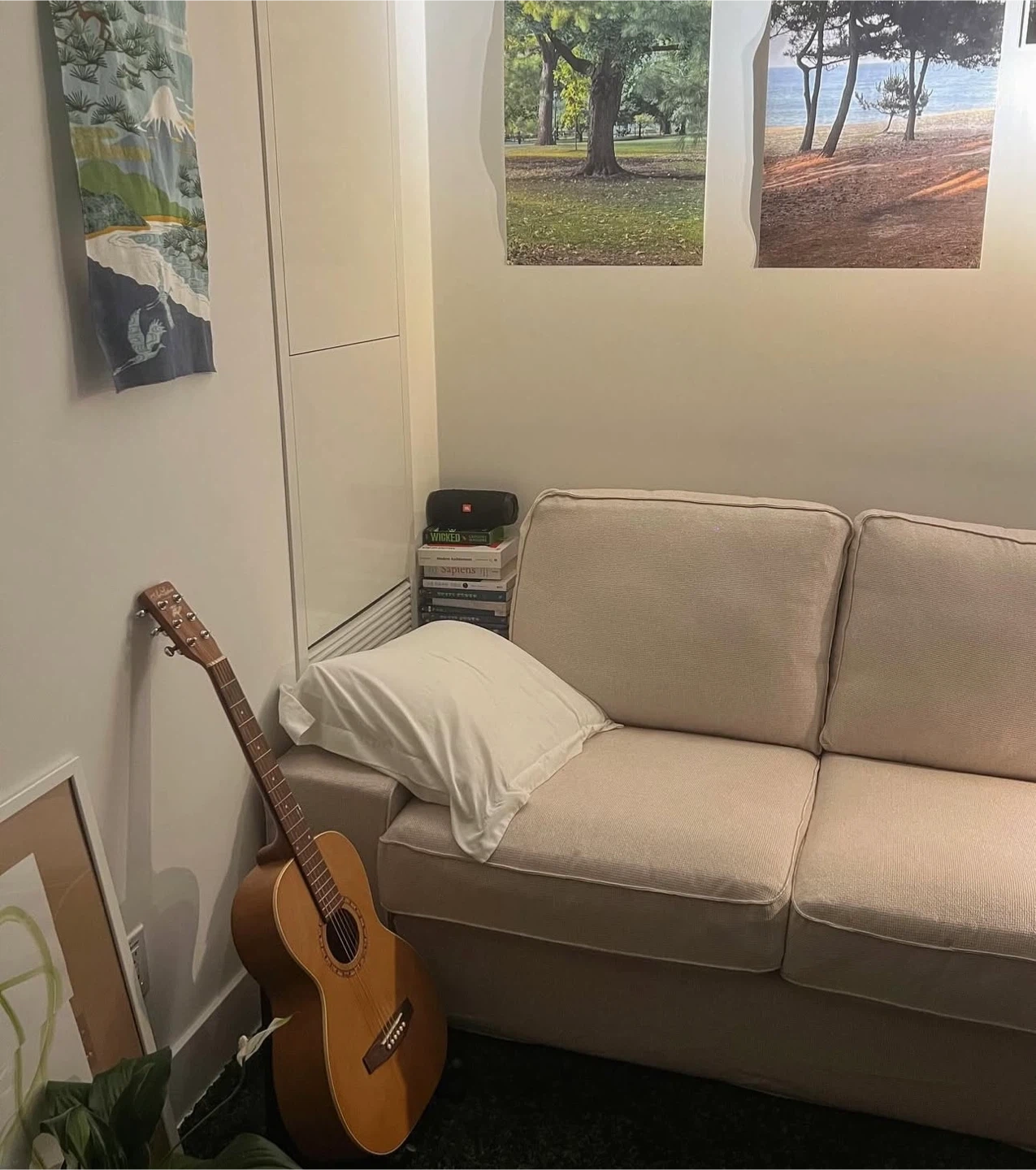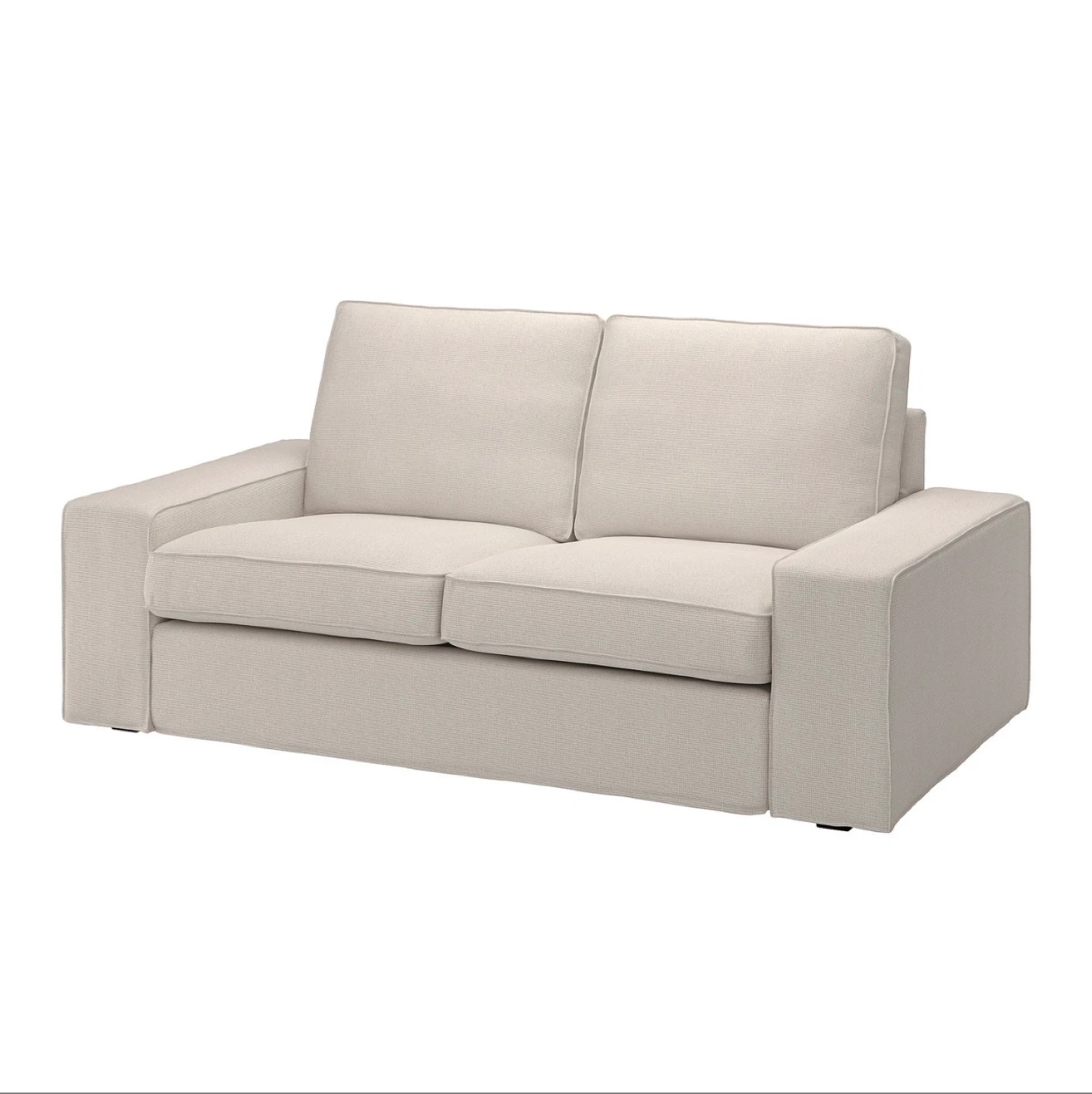 A light cream-coloured sofa with clean lines. It has a sturdy frame and comfortable cushions. This sofa seats two people.