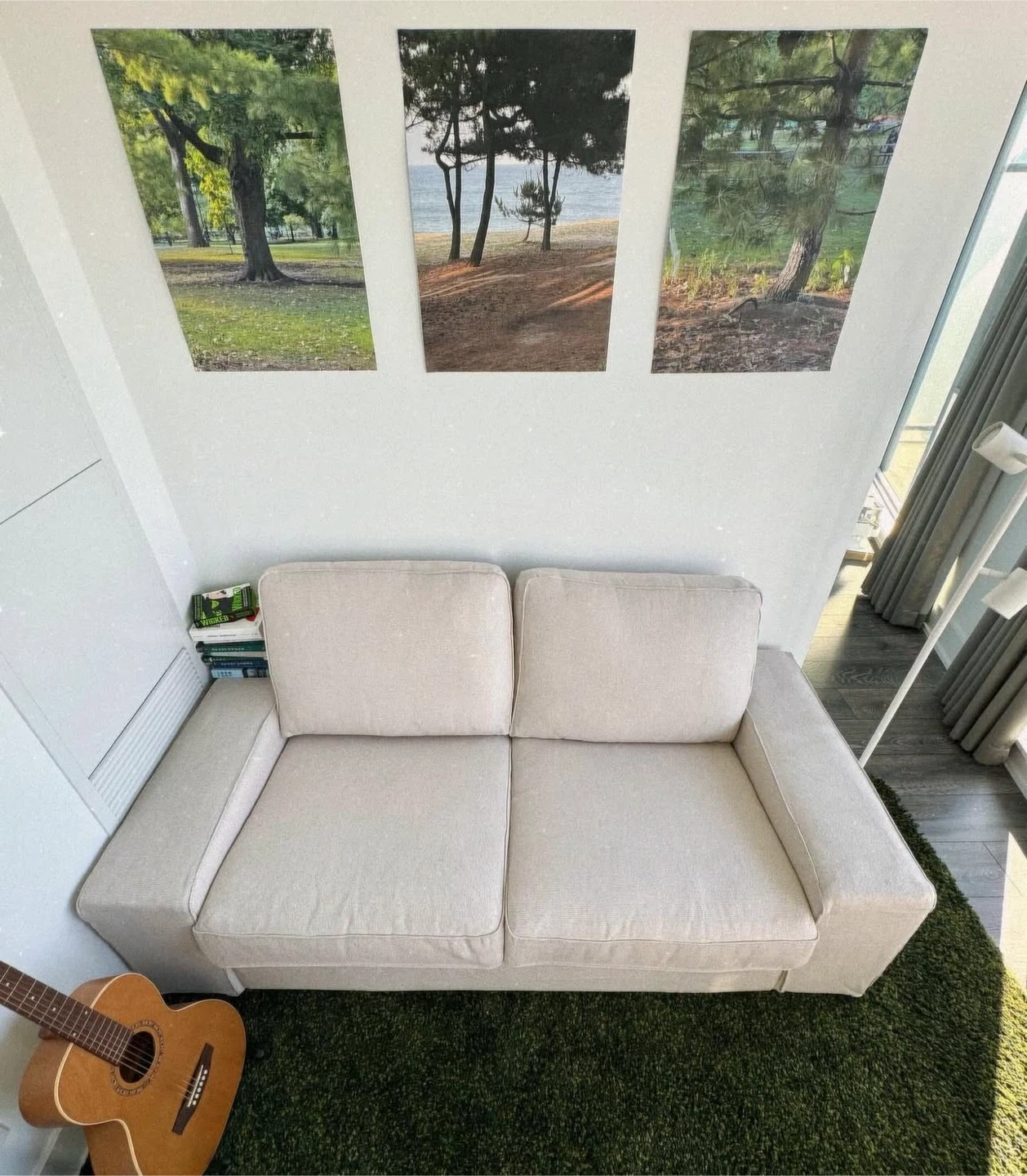 A light cream-coloured sofa with clean lines. It has a sturdy frame and comfortable cushions. This sofa seats two people.