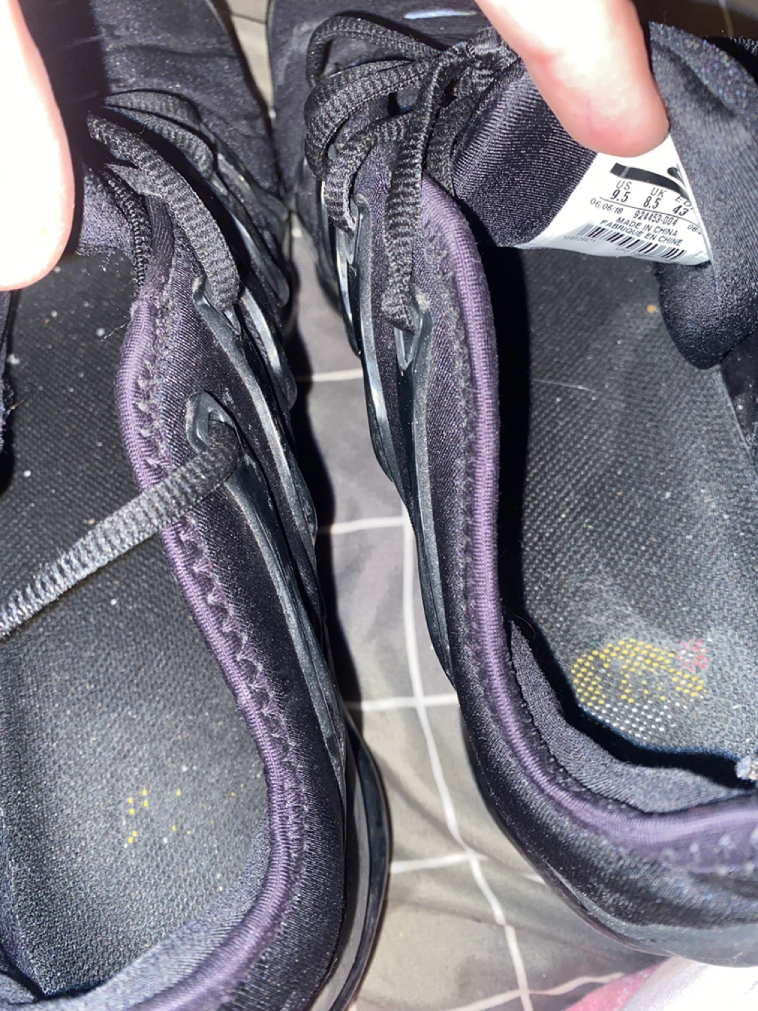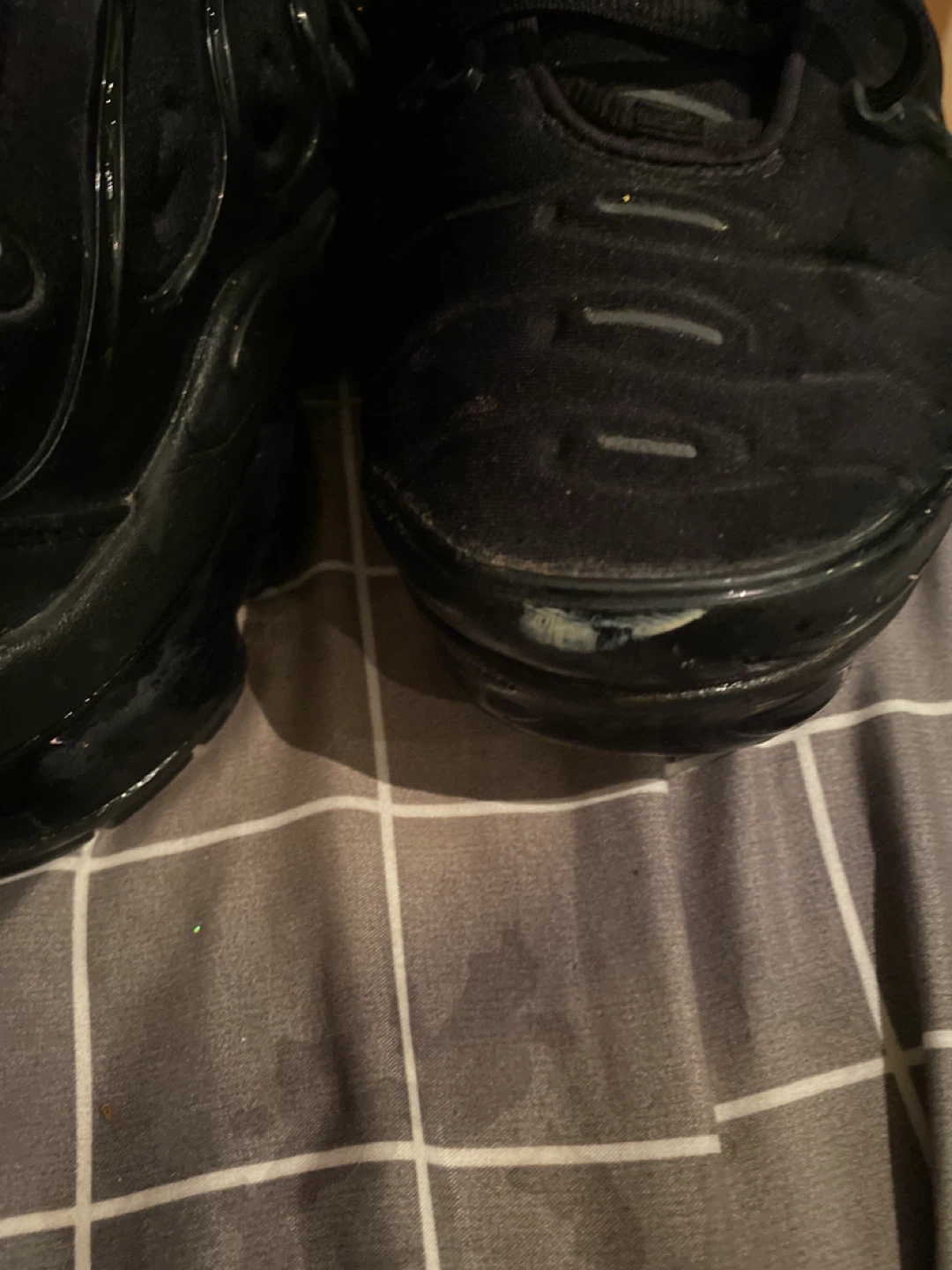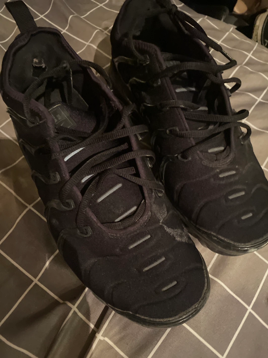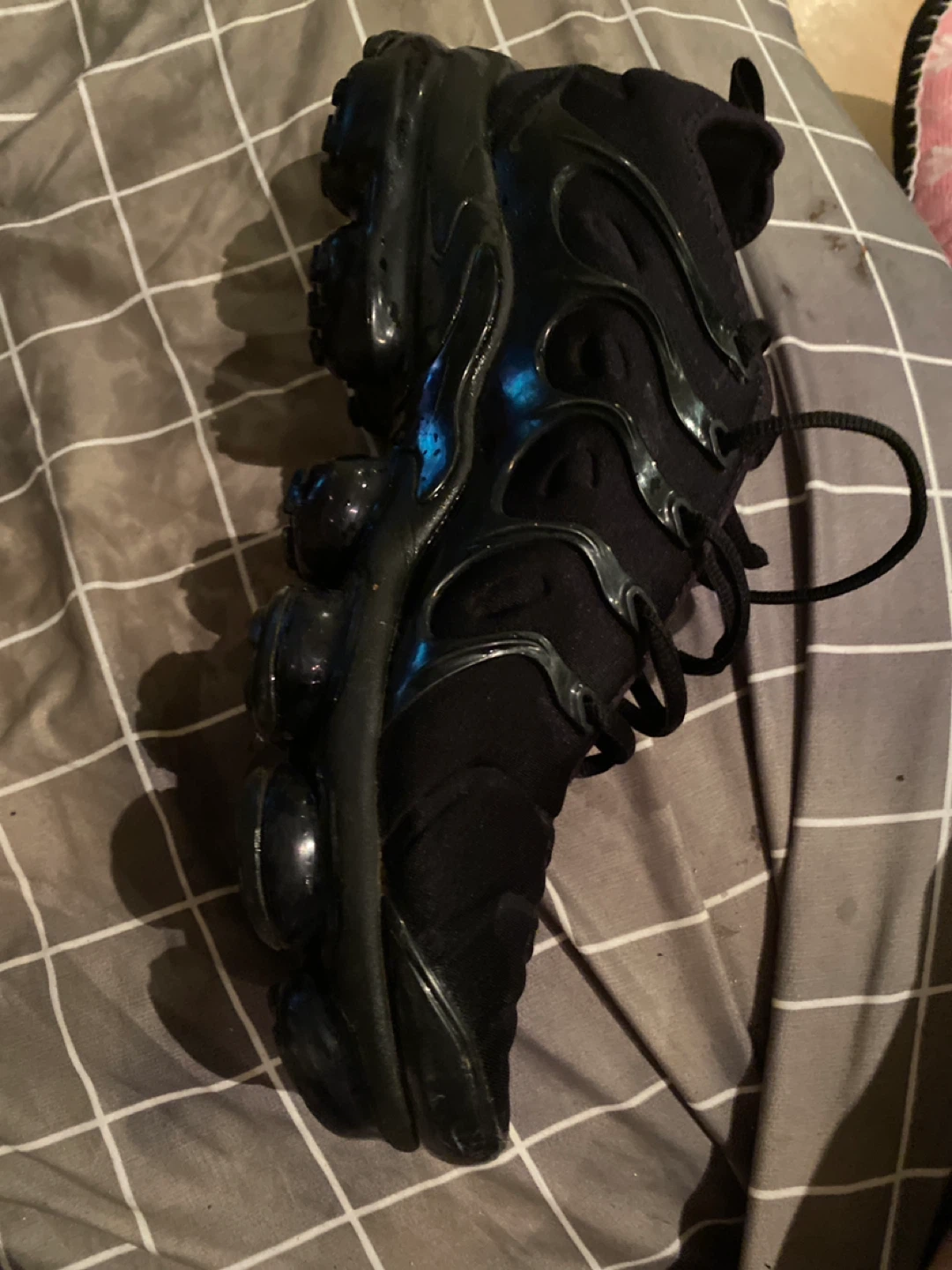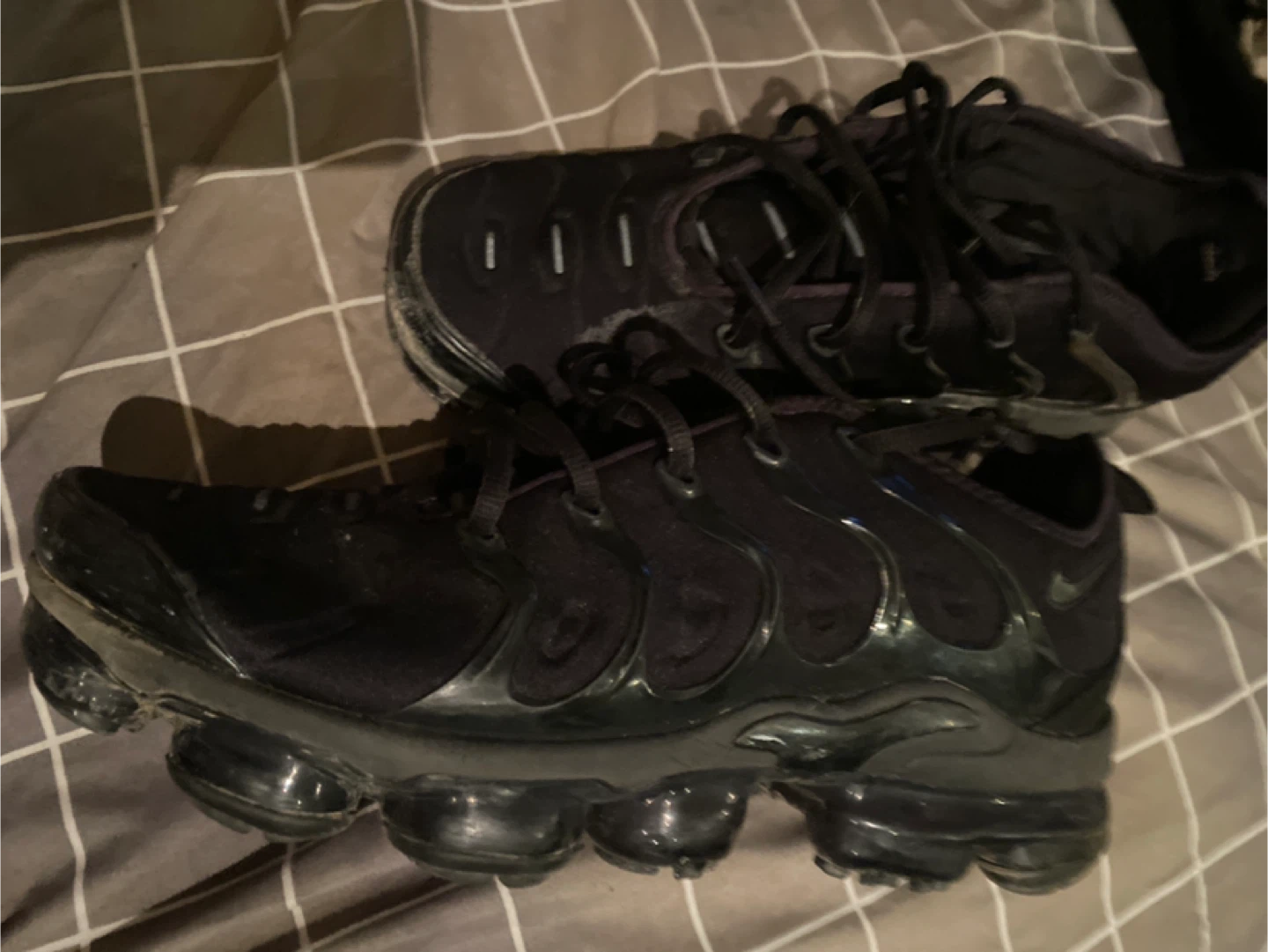 Selling a pair of Nike Air VaporMax Plus in black. They are size US 9.5. There are some signs of wear. In excellent new condition