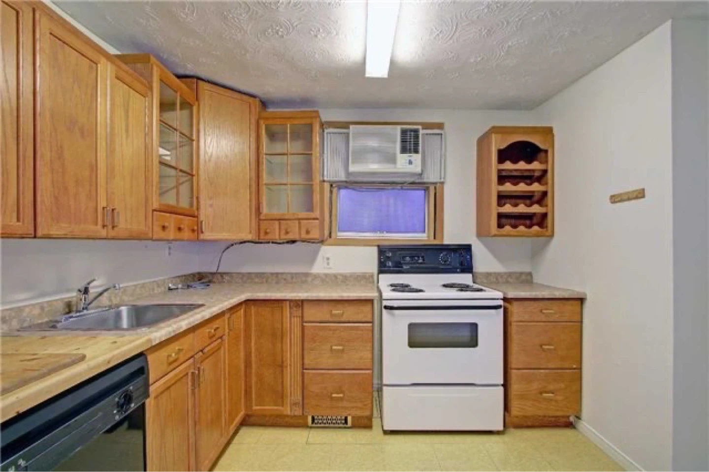 This single story home is in the rear of a 2 story house. Well-lit living room with large window. Spacious eat-in kitchen featuring wine cabinet and AC window unit. In-unit laundry (washer only, no dryer). Bedroom has 2 windows and closet. Bathroom with tub.