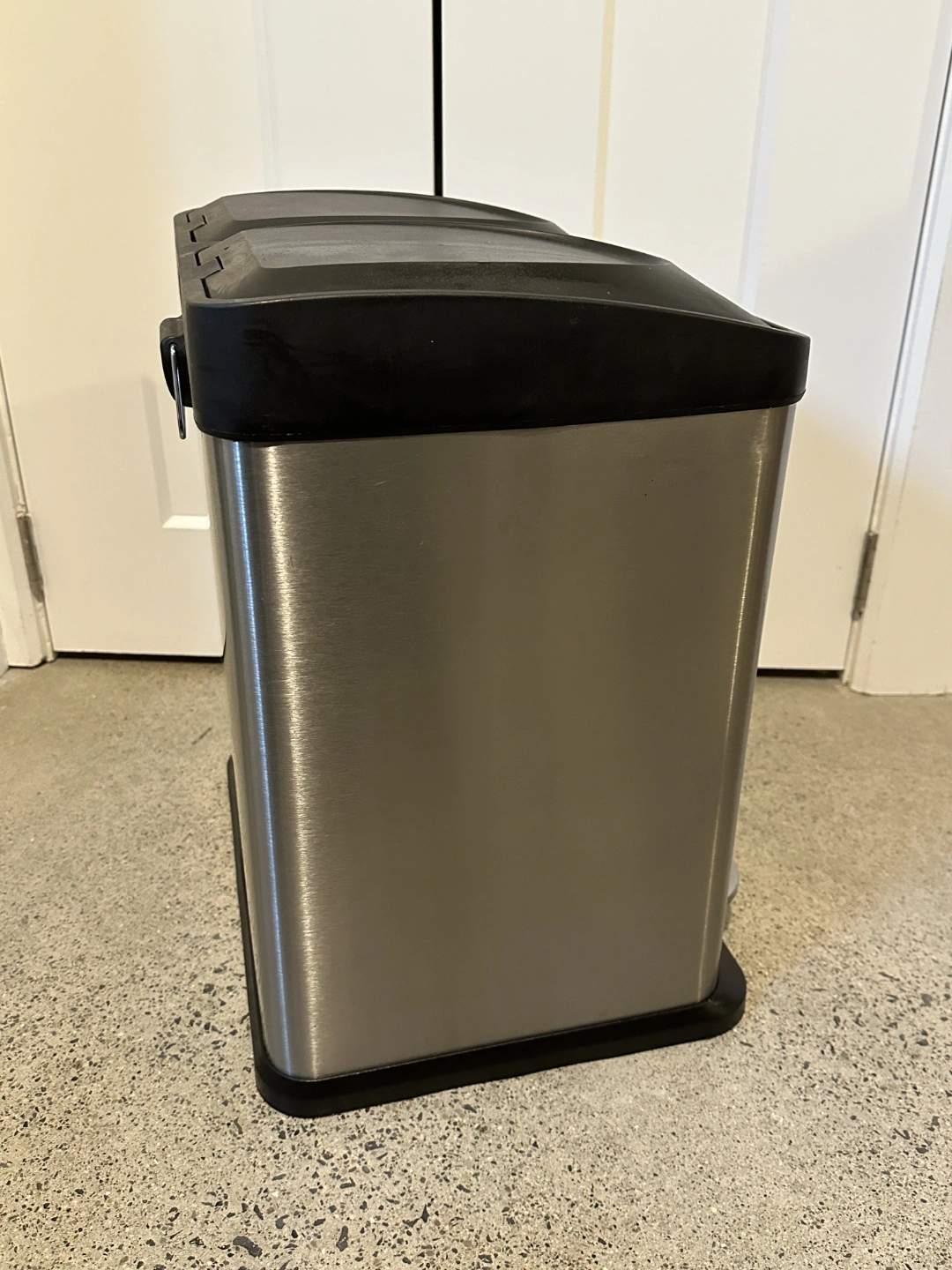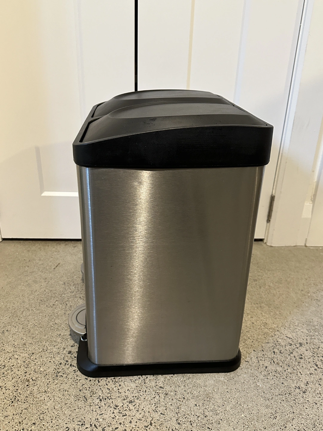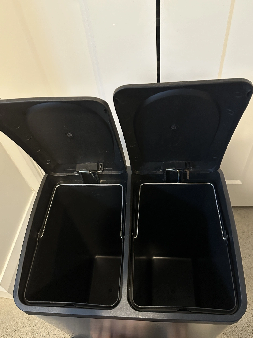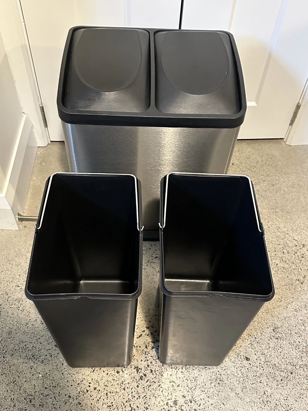Double-compartment kitchen garbage can. Brushed stainless steel exterior. Black plastic lids and base. Foot pedals for easy operation. Good for recycling and garbage.