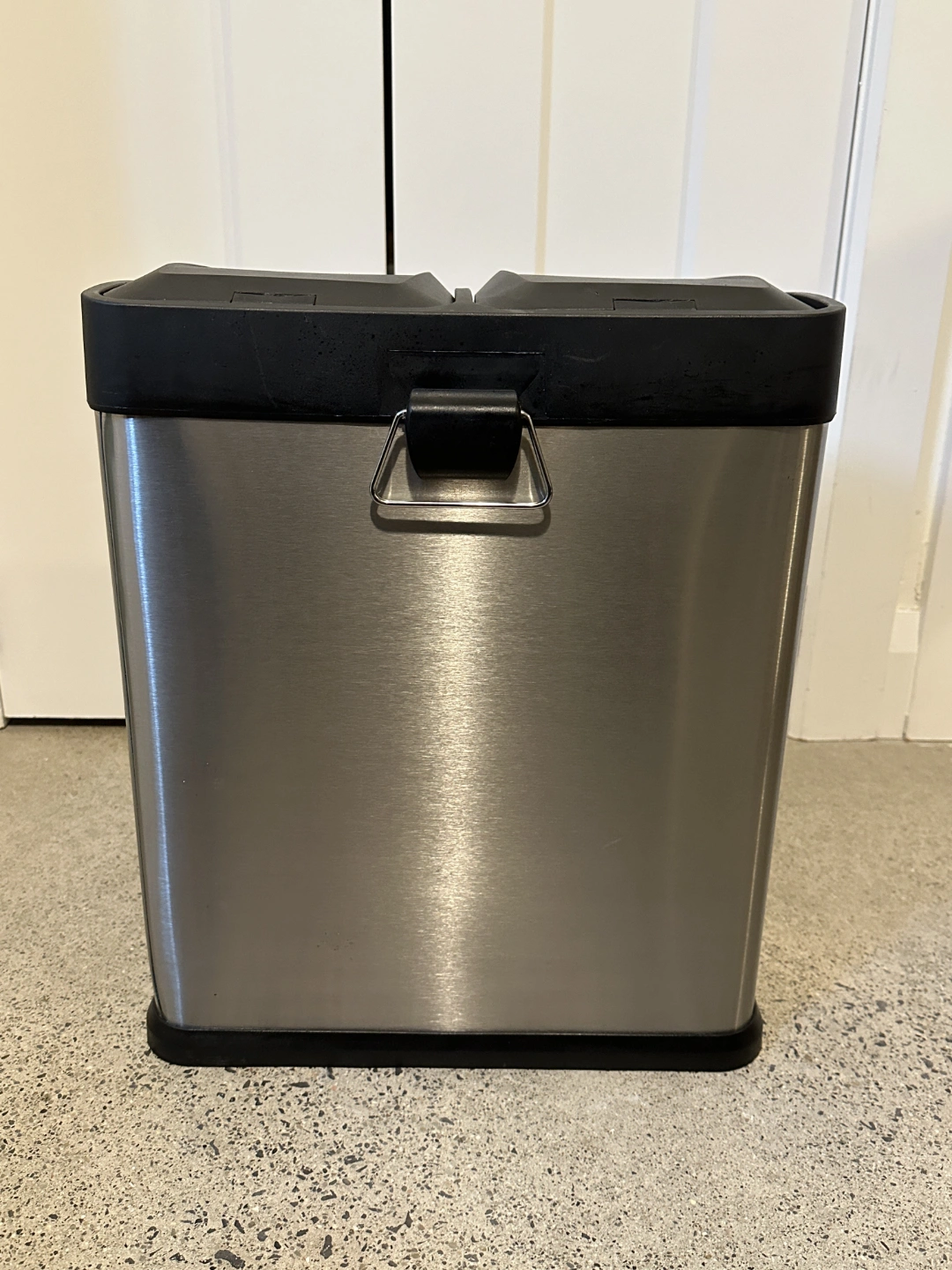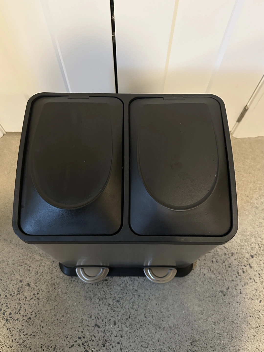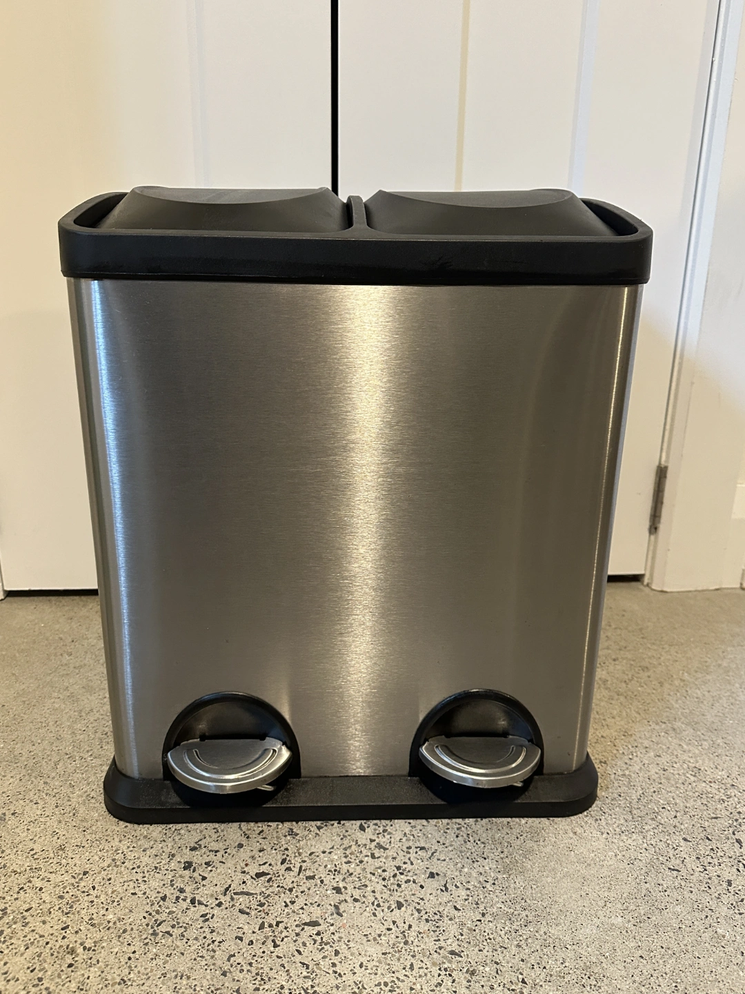 Double-compartment kitchen garbage can. Brushed stainless steel exterior. Black plastic lids and base. Foot pedals for easy operation. Good for recycling and garbage.