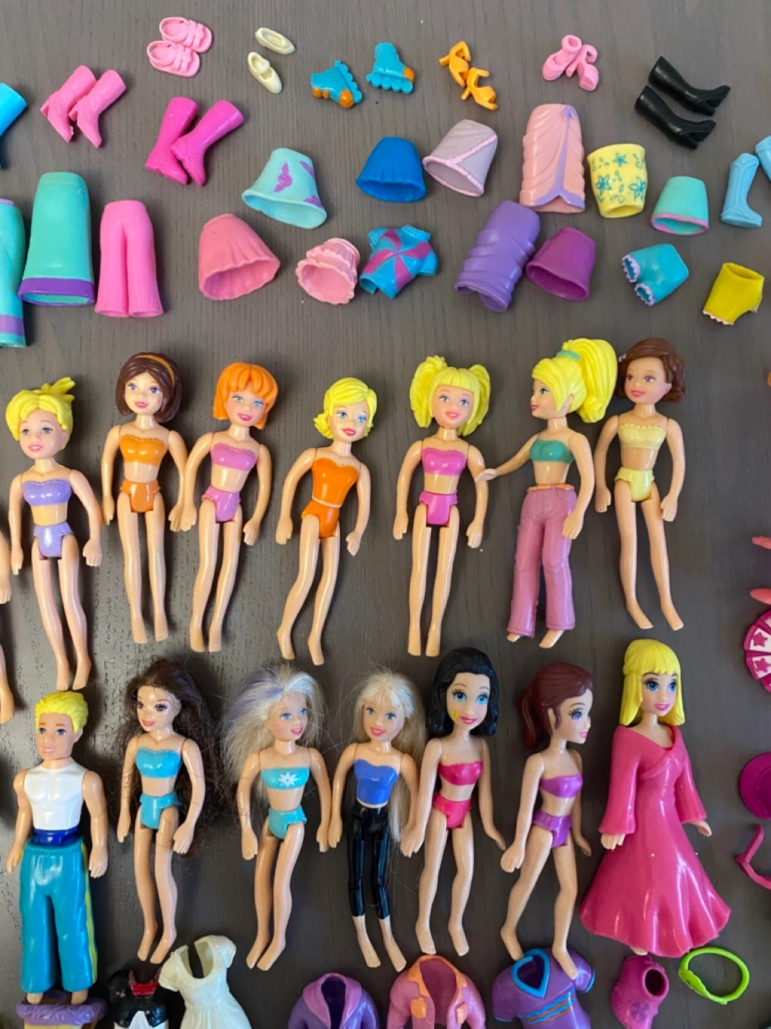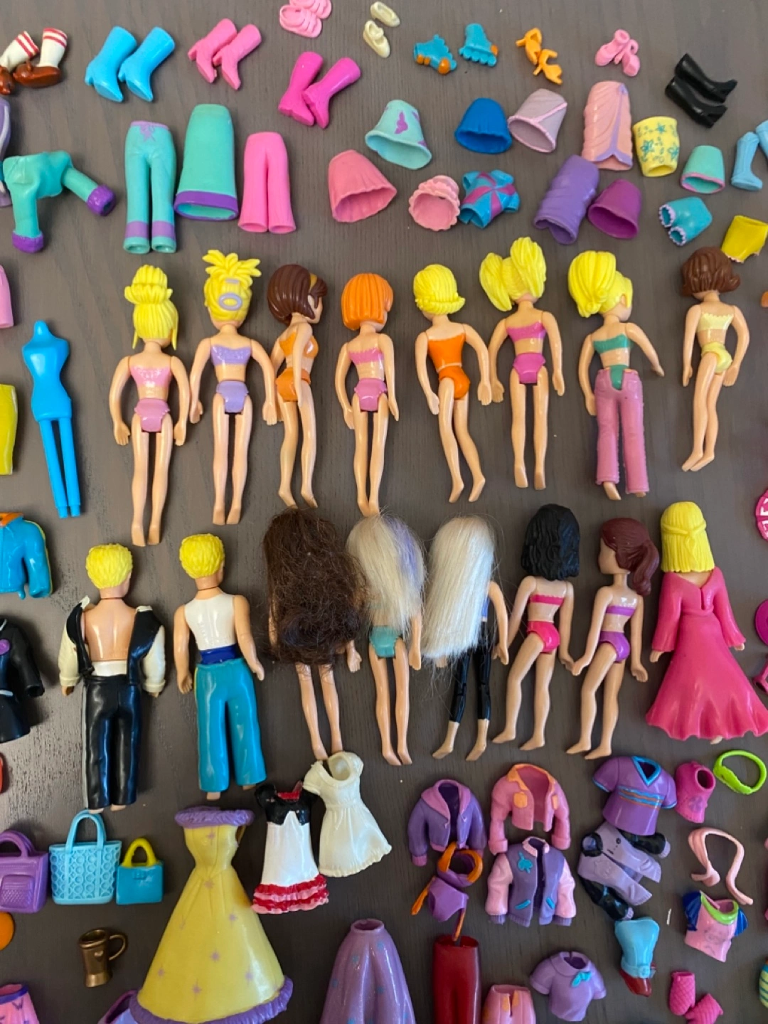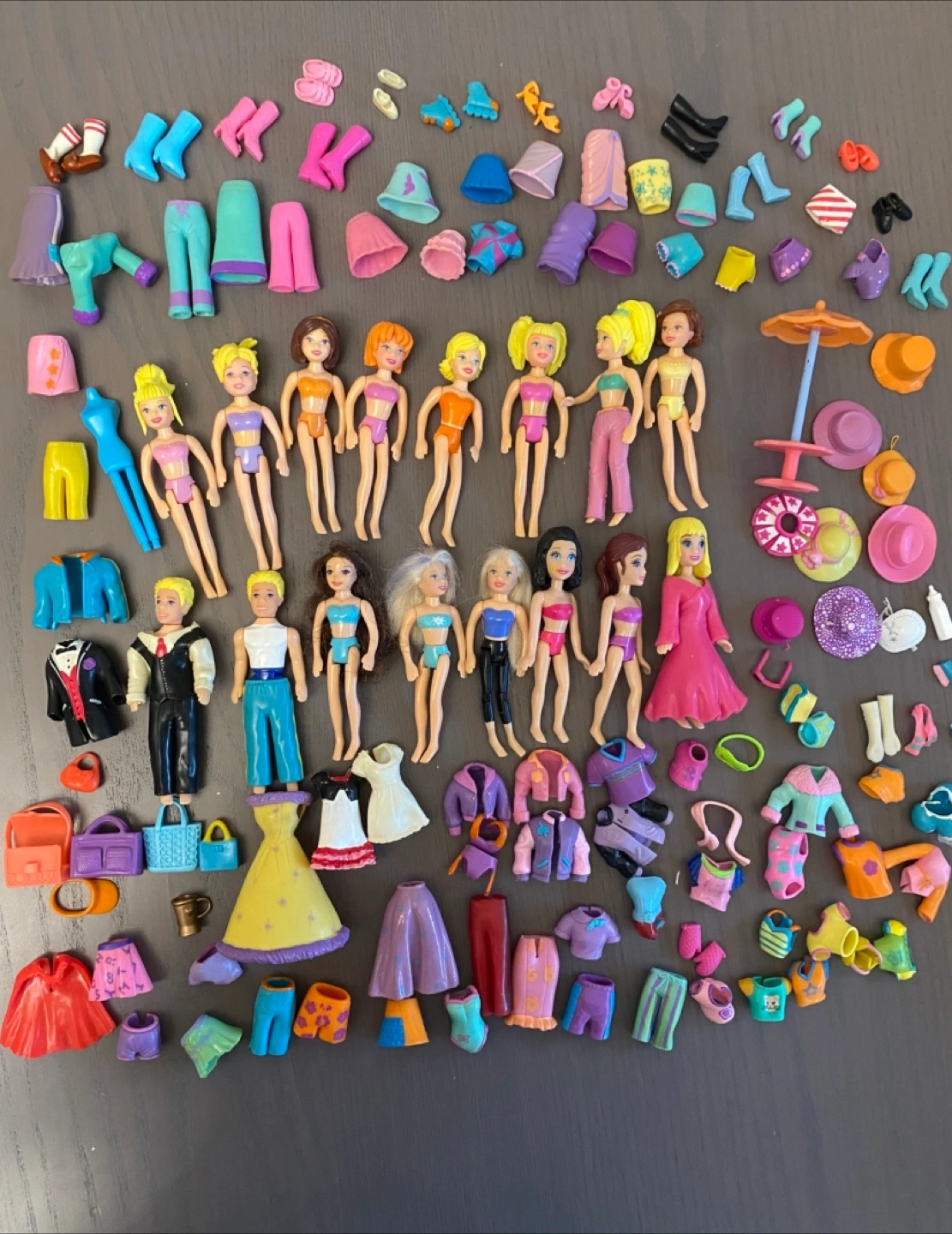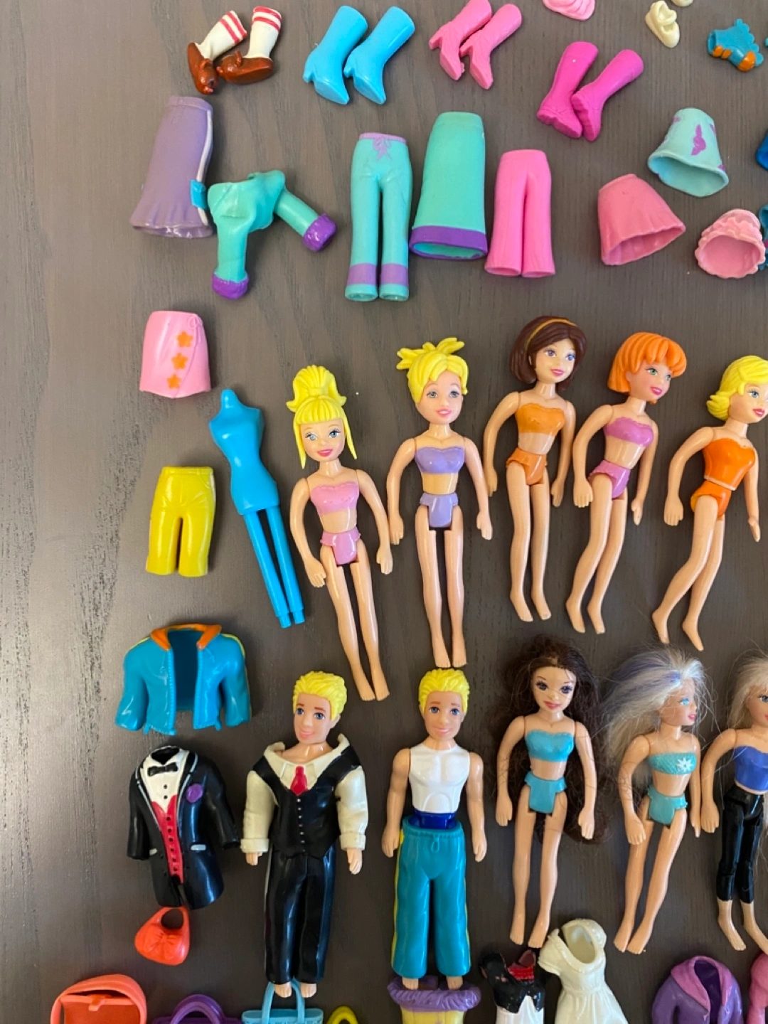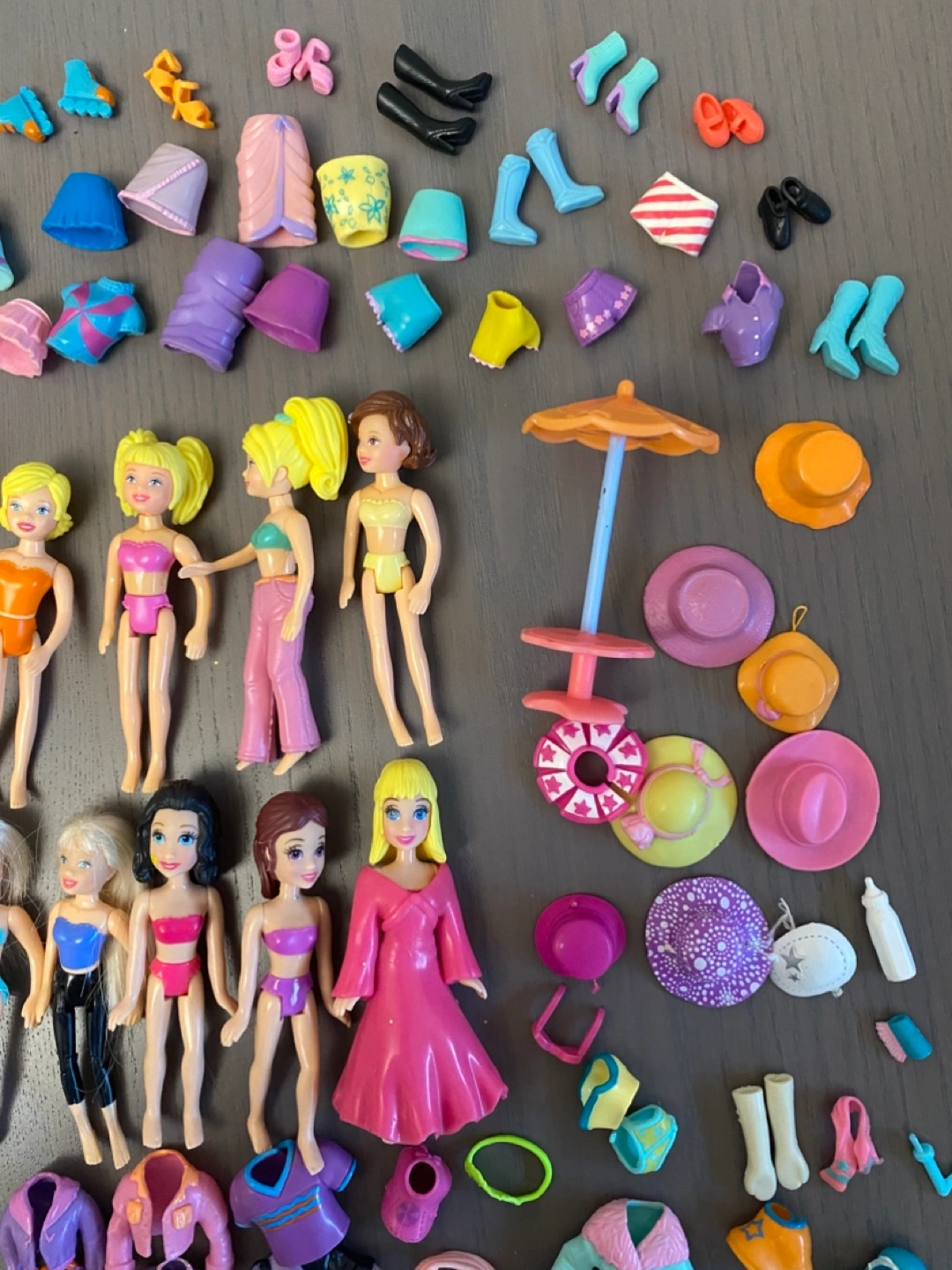 Rare find! This is a large lot of Polly Pocket dolls and clothing accessories. It includes multiple dolls, outfits, shoes, and hats. Everything is pre-owned and ready for new adventures!