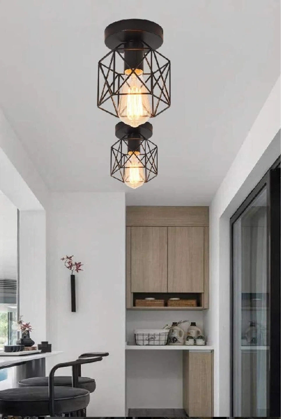 Set of two industrial style flush mount ceiling light fixtures. Black metal cage design with a geometric open frame. Maximum 60W bulb.