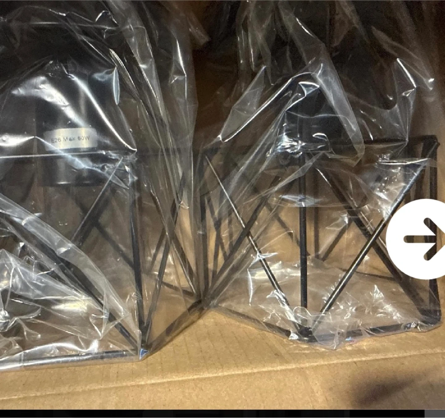 Set of two industrial style flush mount ceiling light fixtures. Black metal cage design with a geometric open frame. Maximum 60W bulb.