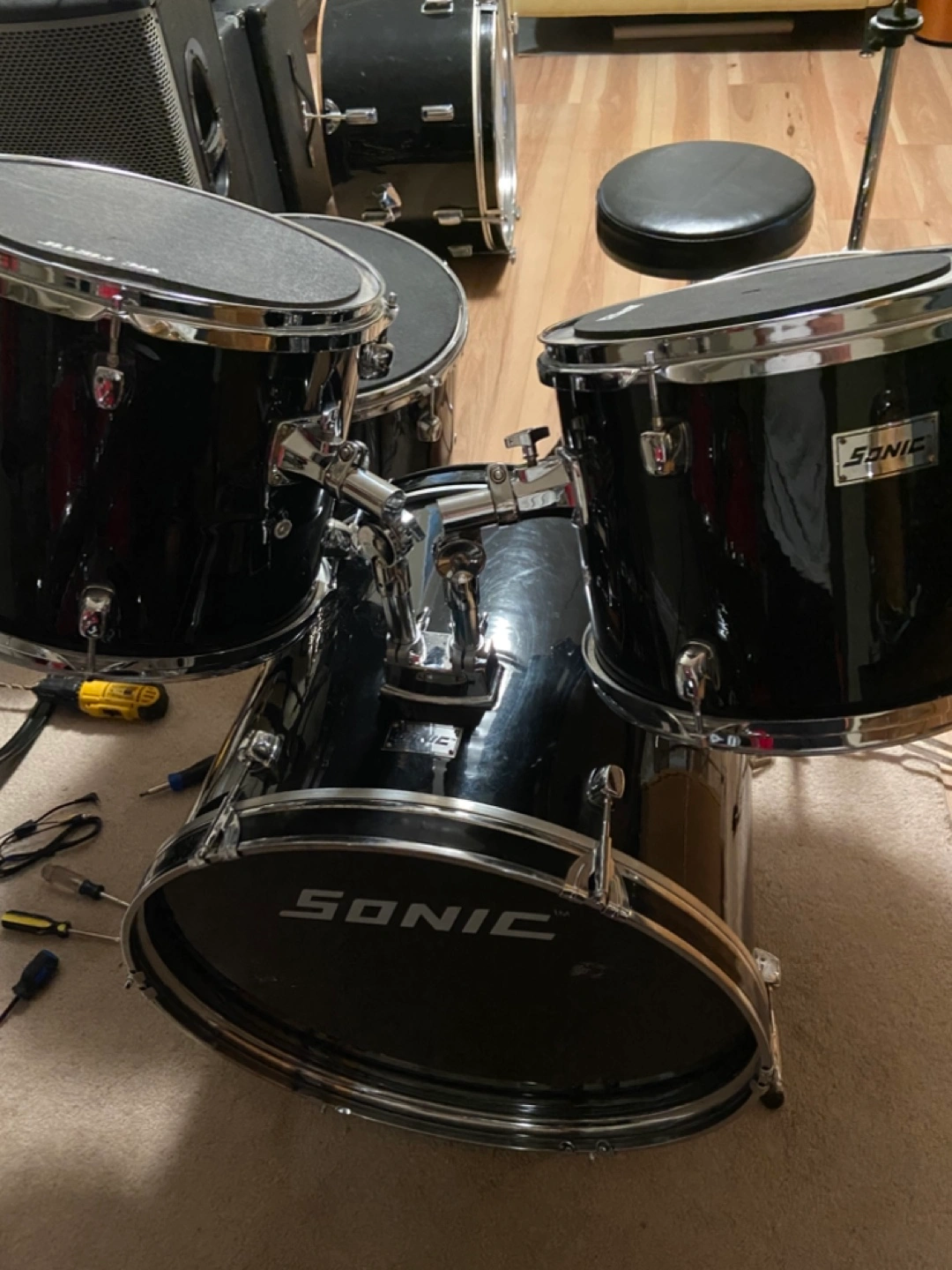 Complete drum set. Includes bass drum, snare drum, toms, hi-hat, and throne. Hardware may be included. Some wear and tear. No kick drum pedal. Includes e-rings and mute pads for pads to keep the family happy. Sonic shells. Two incomplete kits into one useful one.
