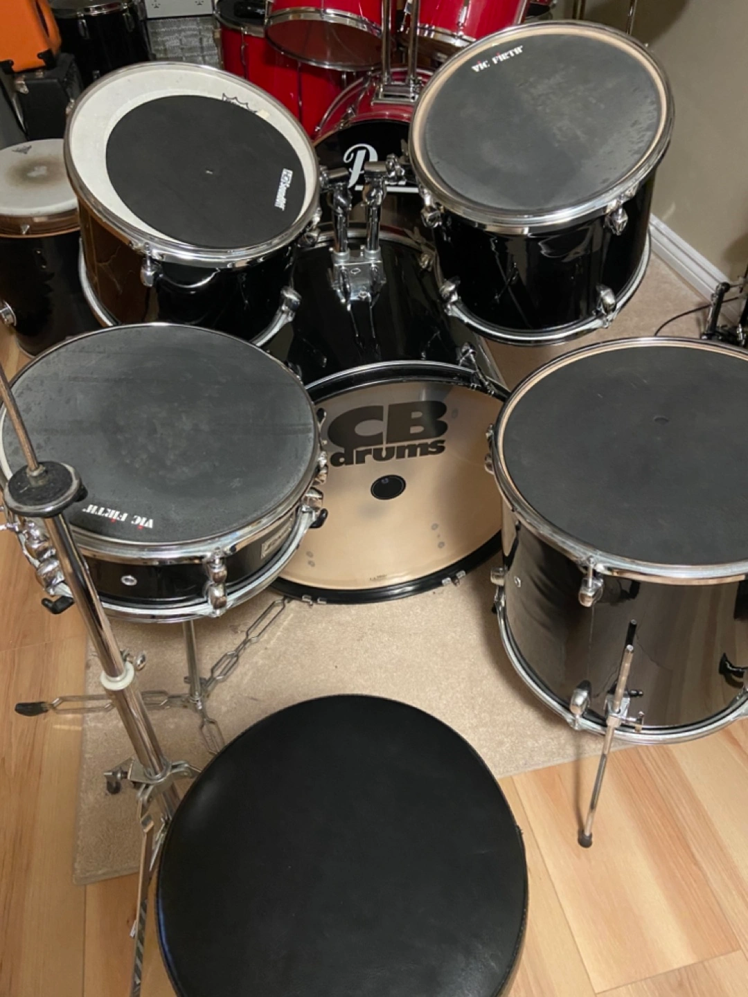 Complete drum set. Includes bass drum, snare drum, toms, hi-hat, and throne. Hardware may be included. Some wear and tear. No kick drum pedal. Includes e-rings and mute pads for pads to keep the family happy. Sonic shells. Two incomplete kits into one useful one.