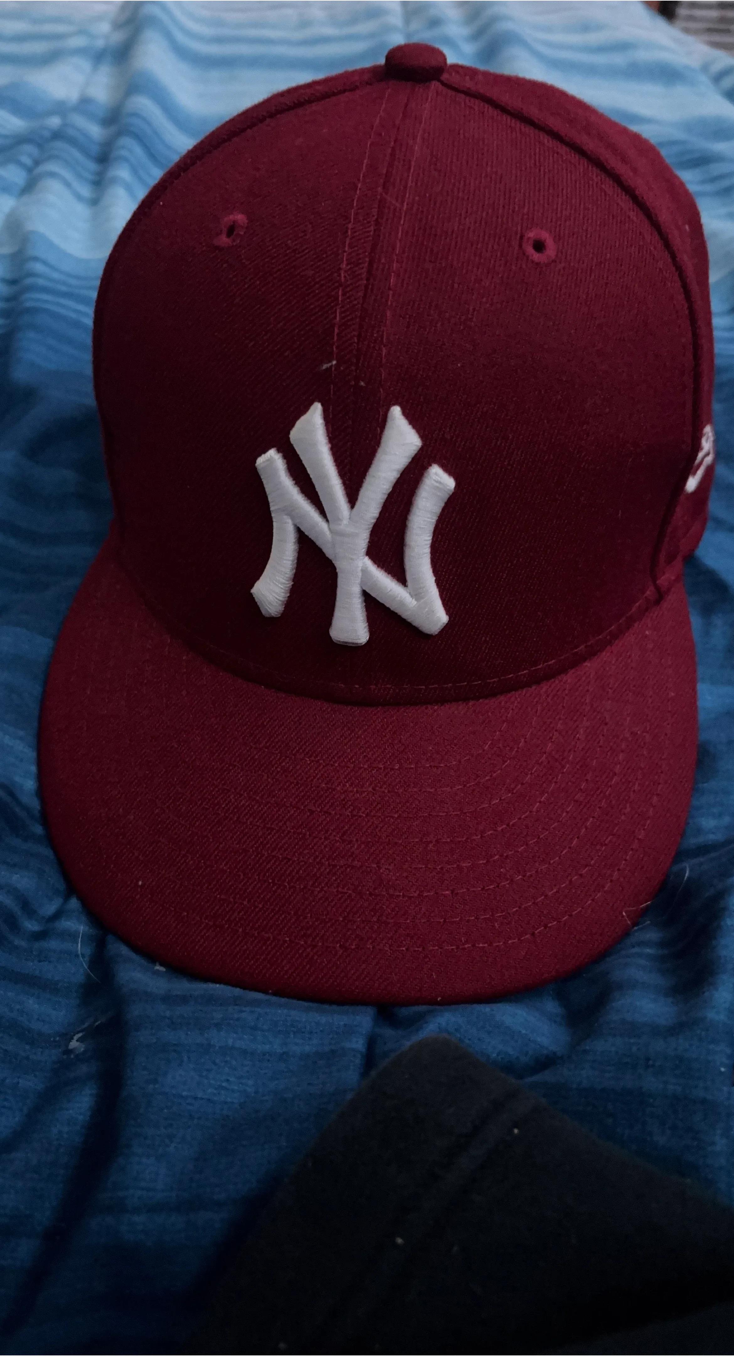 This is a New Era 59FIFTY fitted baseball cap featuring the New York Yankees logo. It's a size 7 3/8. The cap is a deep maroon colour with white embroidery.