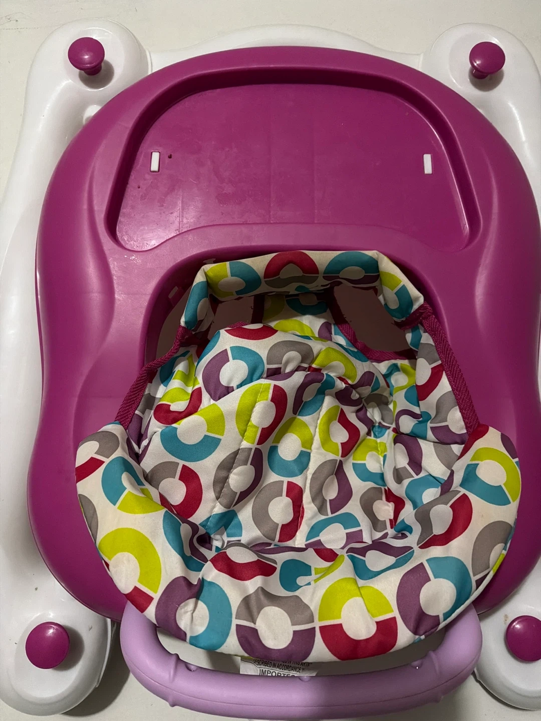 This baby walker features a colorful seat and a sturdy frame. It's designed for little ones learning to explore. The seat material is fabric with a fun, circular pattern.