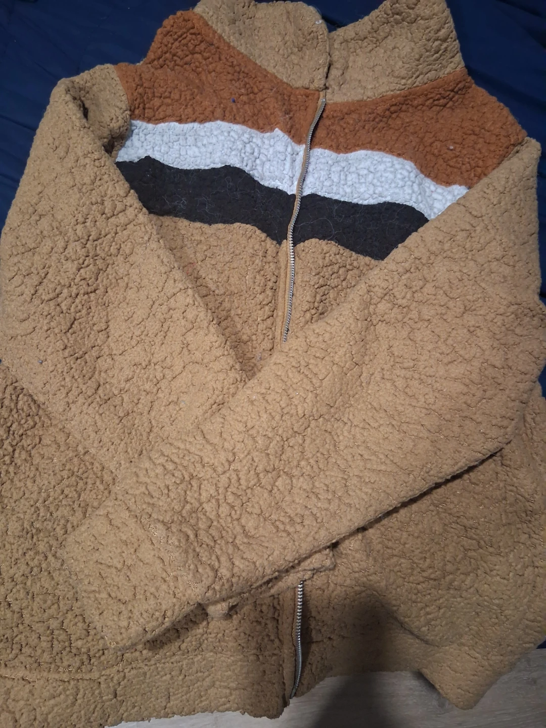 Cozy sherpa fleece jacket with a quarter-zip closure. It has a funnel neck and features horizontal stripes in brown, white, and black across the chest. Material is soft fleece.