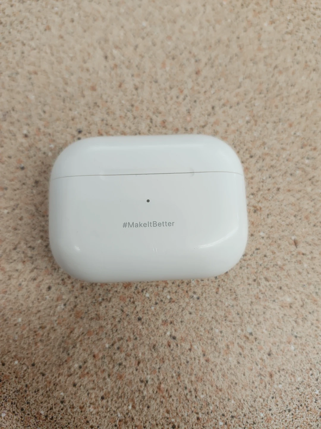 This is a white wireless earbud charging case. It has the inscription "#MakeItBetter". The case is white and measures approximately 6cm x 5cm x 2cm.