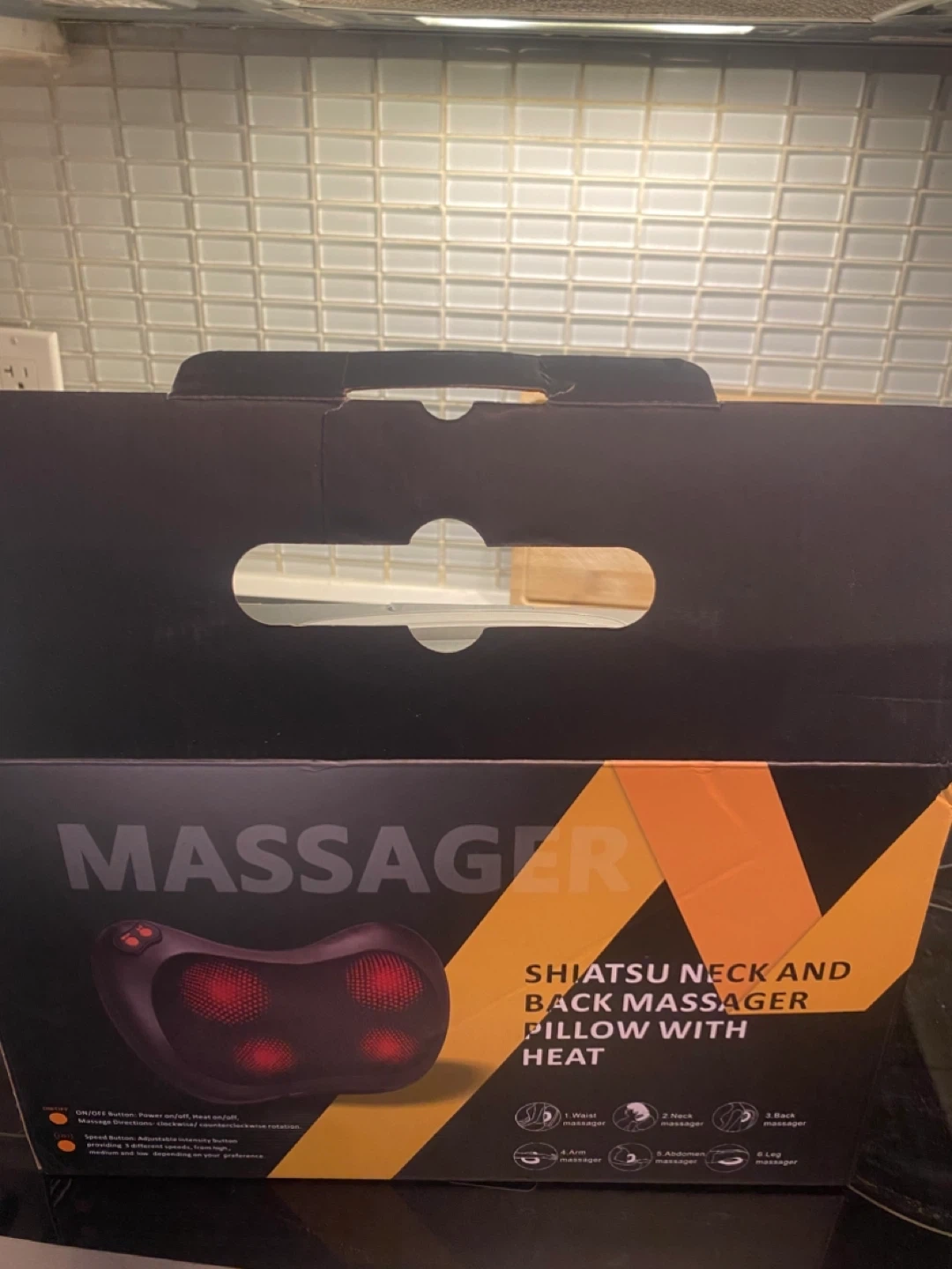 Selling a Shiatsu Neck and Back Massager Pillow with Heat. Package includes: AC adapter, car adapter, user manual, and the massager pillow itself. Package size is 12.6 x 4.3 x 7.8 inches (32x11x20cm).