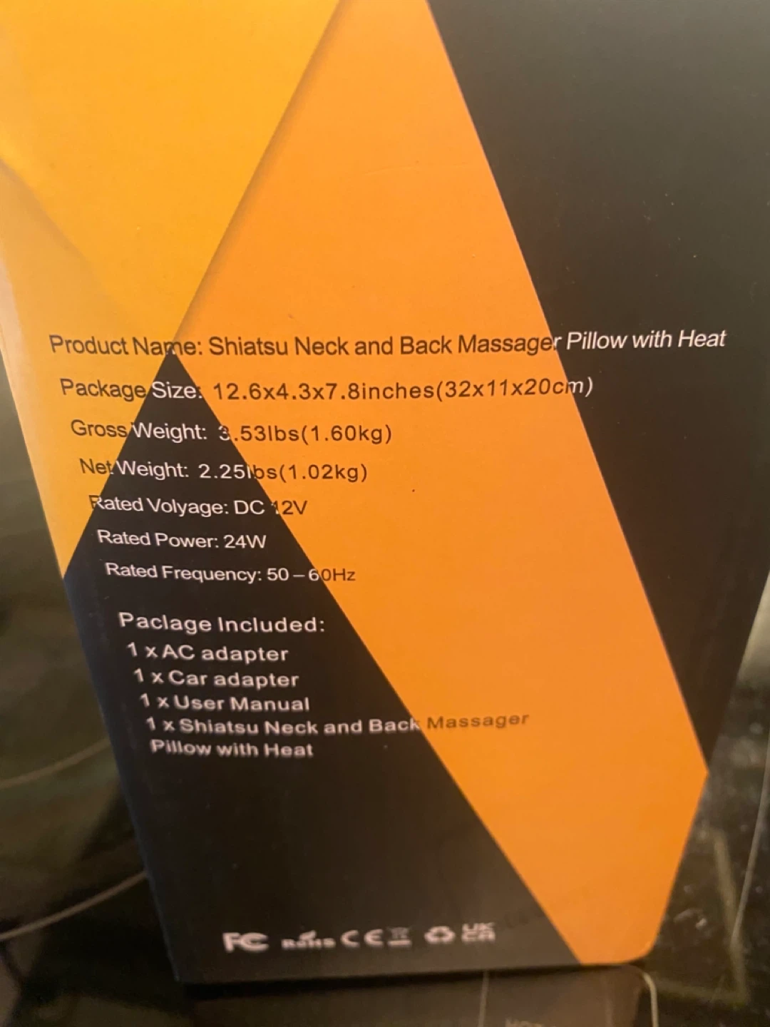 Selling a Shiatsu Neck and Back Massager Pillow with Heat. Package includes: AC adapter, car adapter, user manual, and the massager pillow itself. Package size is 12.6 x 4.3 x 7.8 inches (32x11x20cm).
