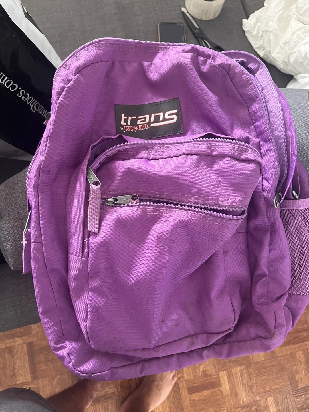 Selling a Jansport Trans backpack in purple! It's a great backpack for school, work, or travel. It has a spacious main compartment and a front pocket for easy access to your essentials. The backpack is in good condition and ready for a new adventure
